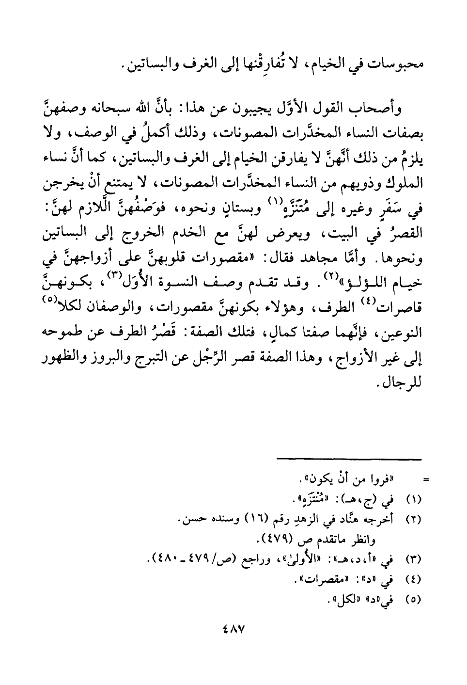 وأصحاب القول الأوَّل يجيبون عن هذا: بأنَّ اللَّه سبحانه وصفهنَّ بصفات النساء المخدَّرات المصونات، وذلك أكملُ في الوصف، ولا يلزمُ من ذلك أنَّهنَّ لا يفارقن الخيام إلى الغرف والبساتين، كما أنَّ نساء الملوك وذويهم من النساء المخدَّرات المصونات، لا يمتنع أنْ يخرجن في سَفَرٍ وغيره إلى مُتَنَزَّهٍ (¬١) وبستانٍ ونحوه، فوَصْفُهنَّ الَّلازم لهنَّ: القصرُ في البيت، ويعرض لهنَّ مع الخدم الخروج إلى البساتين ونحوها. وأمَّا مجاهد فقال: "مقصورات قلوبهنَّ على أزواجهنَّ في خيام اللؤلؤ" (¬٢) . وقد تقدم وصف النسوة الأُوَل (¬٣) ، بكونهنَّ قاصرات (¬٤) الطرف، وهؤلاء بكونهنَّ مقصورات، والوصفان لكلا (¬٥) النوعين، فإنَّهما صفتا كمالٍ، فتلك الصفة: قَصْرُ الطرف عن طموحه إلى غير الأزواج، وهذا الصفة قصر الرِّجْل عن التبرج والبروز والظهور للرجال.