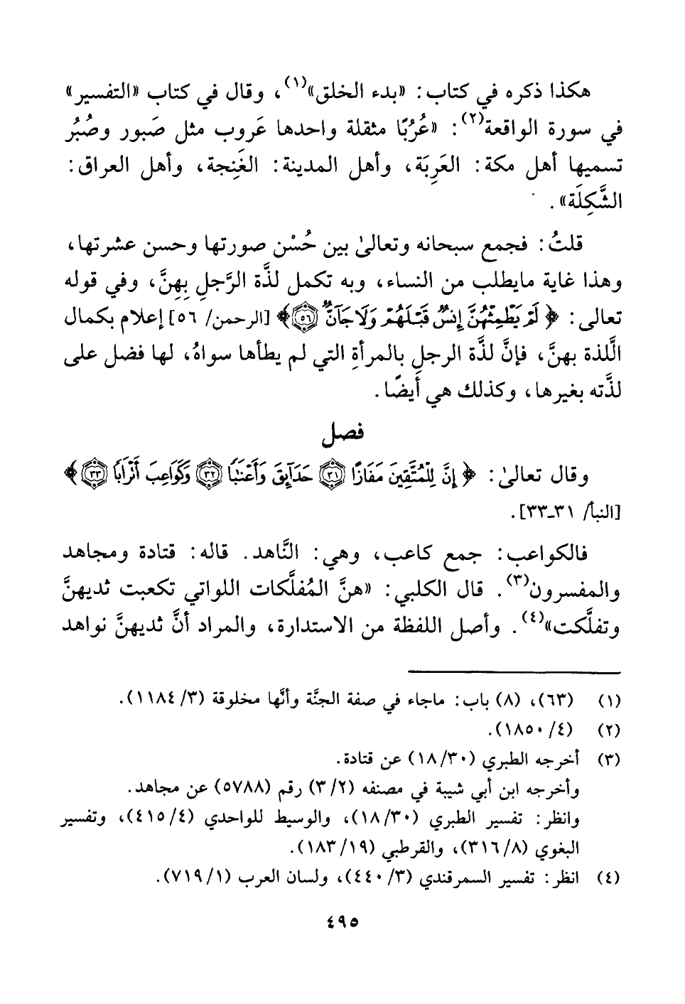 قلتُ: فجمع سبحانه وتعالى بين حُسْن صورتها وحسن عشرتها، وهذا غاية ما يطلب من النساء، وبه تكمل لذَّة الرَّجلِ بِهِنَّ، وفي قوله تعالى: {لَمْ يَطْمِثْهُنَّ إِنْسٌ قَبْلَهُمْ وَلَا جَانٌّ (٥٦)} [الرحمن: ٥٦] إعلام بكمال الَّلذة بهنَّ، فإنَّ لذَّة الرجلِ بالمرأةِ التي لم يطأها سواهُ، لها فضل على لذَّته بغيرها، وكذلك هي أيضًا.
