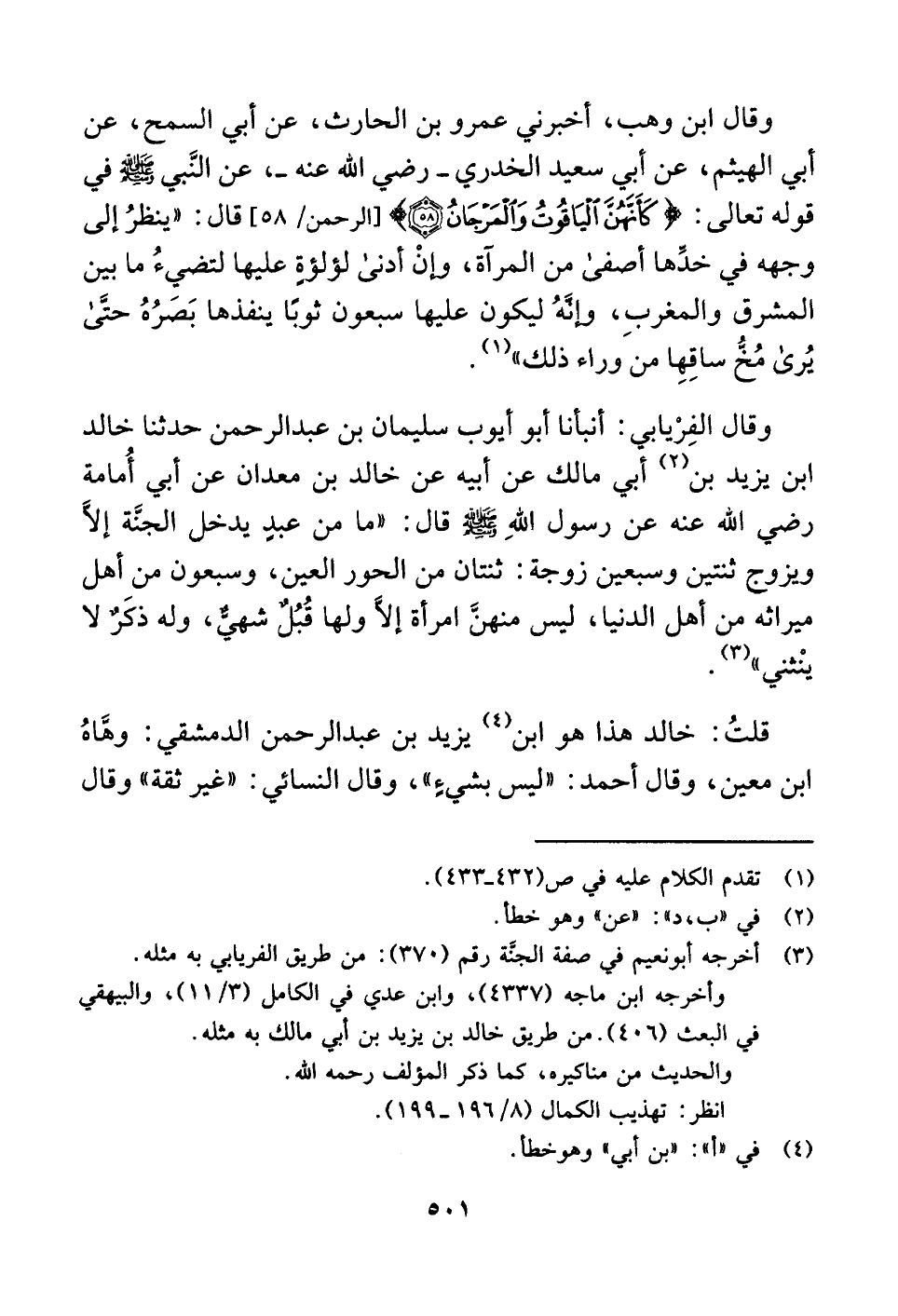وقال ابن وهب، أخبرني عمرو بن الحارث، عن أبي السمح، عن أبي الهيثم، عن أبي سعيد الخدري -رضي اللَّه عنه-، عن النَّبي -صلى اللَّه عليه وسلم- في قوله تعالى: {كَأَنَّهُنَّ الْيَاقُوتُ وَالْمَرْجَانُ (٥٨) } [الرحمن: ٥٨] قال: "ينظرُ إلى وجهه في خدَّها أصفى من المرآة، وانْ أدنى لؤلؤةٍ عليها لتضيءُ ما بين المشرق والمغربِ، وإنَّهُ ليكون عليها سبعون ثوبًا ينفذها بَصَرُهُ حتَّى يُرى مُخُّ ساقِهِا من وراء ذلك" (¬١) .