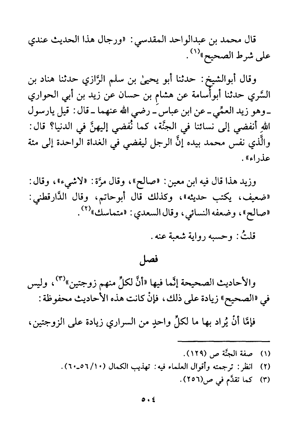 وقال أبو الشيخ: حدثنا أبو يحيى بن سلم الرَّازي حدثنا هناد بن السَّري حدثنا أبو أُسامة عن هشامِ بن حسان عن زيد بن أبي الحواري - وهو زيد العمَّي - عن ابن عباس -رضي اللَّه عنهما- قال: قيل يا رسول اللَّهِ أنفضي إلى نسائنا في الجنَّة، كما نُفضي إليهنَّ في الدنيا؟ قال: والَّذي نفس محمد بيده إنَّ الرجل ليفضي في الغداة الواحدة إلى مئة عذراء".