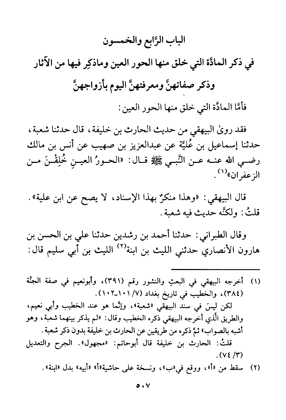 الباب الرَّابع والخمسون في ذكر المادَّة التي خلق منها الحور العين وما ذكِر فيها من الآثار وذكر صفاتهنَّ ومعرفتهنَّ اليوم بأزواجهنَّ