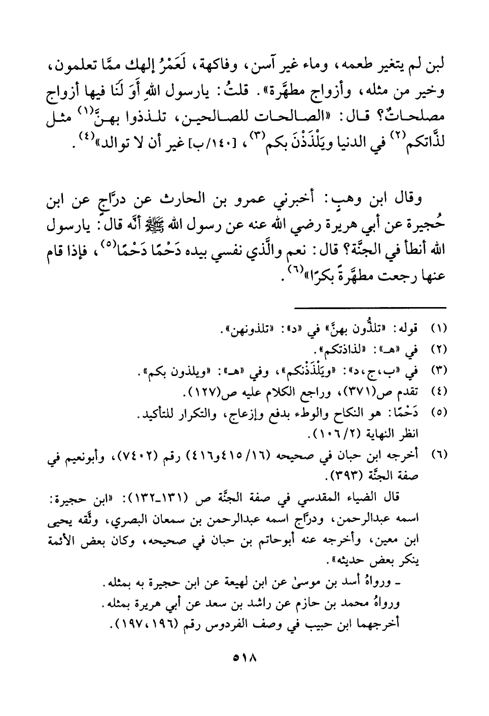 وقال ابن وهبٍ: أخبرني عمرو بن الحارث عن درَّاجٍ عن ابن حُجيرة عن أبي هريرة رضي اللَّه عنه عن رسول اللَّه -صلى اللَّه عليه وسلم- أنَّه قال: يا رسول اللَّه أنطأ في الجنَّة؟ قال: نعم والَّذي نفسي بيده دَحْمًا دَحْمًا (¬٥) ، فإذا قام عنها رجعت مطهَّرةً بكرًا" (¬٦) .