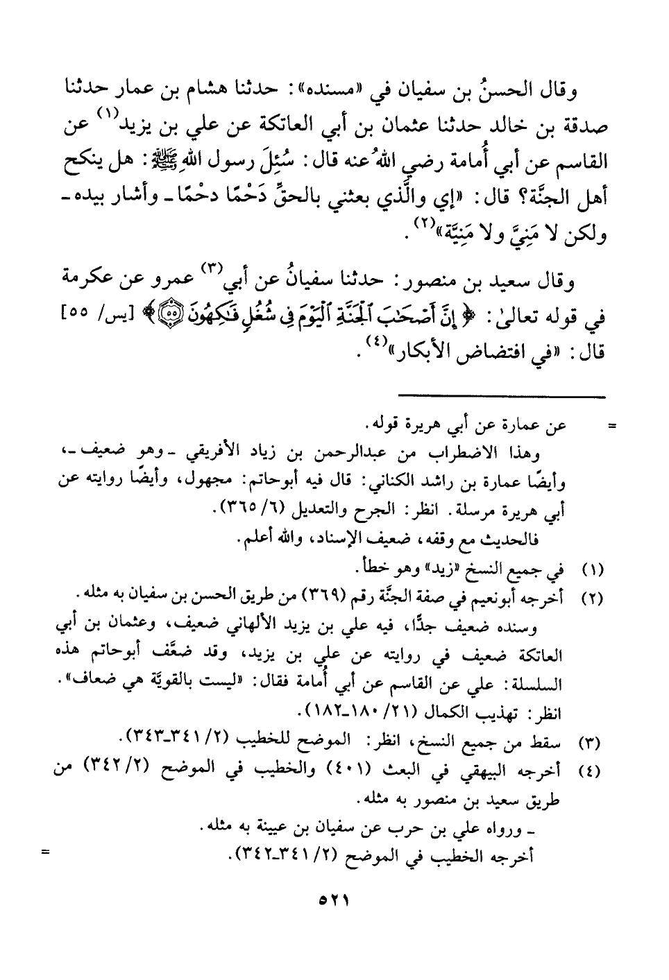 وقال سعيد بن منصور: حدثنا سفيانُ عن أبي (¬٣) عمرو عن عكرمة في قوله تعالى: {إِنَّ أَصْحَابَ الْجَنَّةِ الْيَوْمَ فِي شُغُلٍ فَاكِهُونَ (٥٥) } [يس: ٥٥] قال: "في افتضاض الأبكار" (¬٤) .