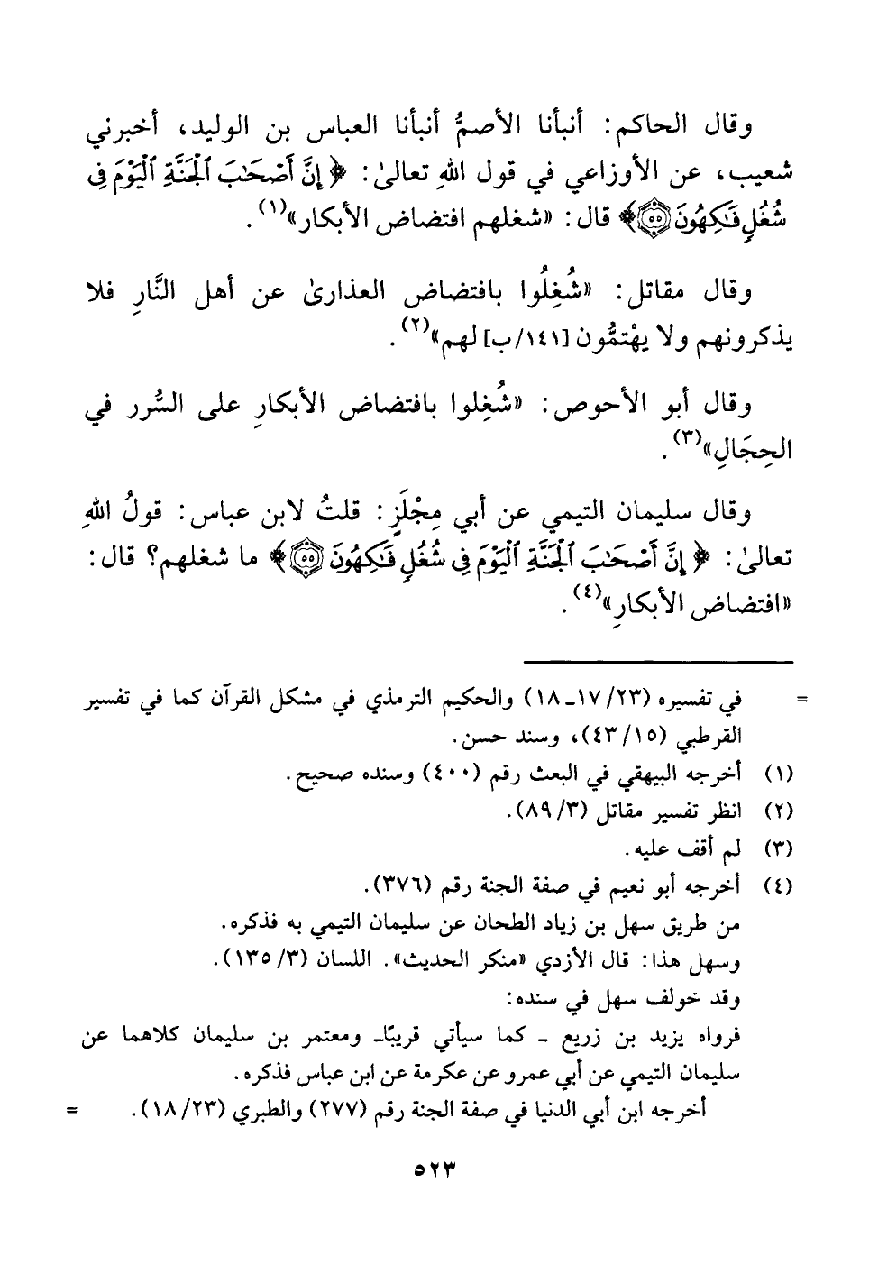 وقال سليمان التيمي عن أبي مِجْلَزٍ: قلتُ لابن عباس: قولُ اللَّهِ تعالى: {إِنَّ أَصْحَابَ الْجَنَّةِ الْيَوْمَ فِي شُغُلٍ فَاكِهُونَ (٥٥) } ما شغلهم؟ قال: "افتضاض الأبكارِ" (¬٤) .