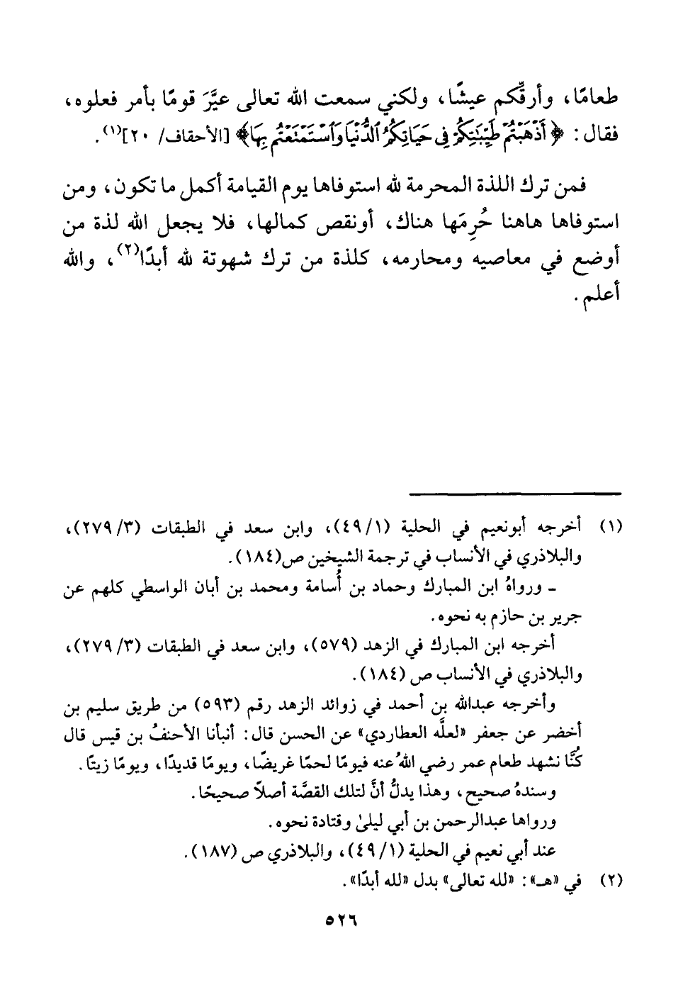 طعامًا، وأرقَّكم عيشًا، ولكني سمعت اللَّه تعالى عيَّرَ قومًا بأمر فعلوه، فقال: {أَذْهَبْتُمْ طَيِّبَاتِكُمْ فِي حَيَاتِكُمُ الدُّنْيَا وَاسْتَمْتَعْتُمْ بِهَا} [الأحقاف: ٢٠] (¬١) .