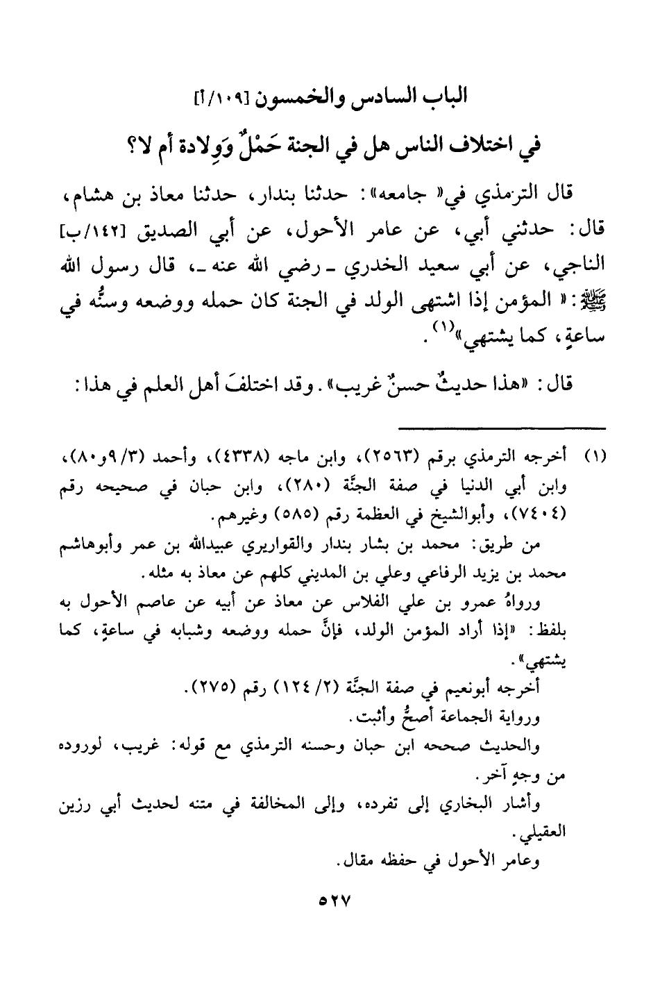 قال الترمذي في "جامعه": حدثنا بندار، حدثنا معاذ بن هشام، قال: حدثني أبي، عن عامر الأحول، عن أبي الصديق الناجي، عن أبي سعيد الخدري -رضي اللَّه عنه-، قال رسول اللَّه -صلى اللَّه عليه وسلم-: "المؤمن إذا اشتهى الولد في الجنة كان حمله ووضعه وسنُّه في ساعةٍ، كما يشتهي" (¬١).