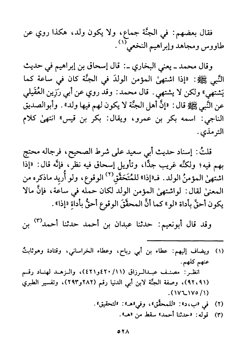 وقال محمد -يعني البخاري-: قال إسحاق بن إبراهيم في حديث النَّبي -صلى اللَّه عليه وسلم-: "إذا اشتهى المؤمن الولدَ في الجنَّة كان في ساعة كما يَشتهي" ولكن لا يشتهي. قال محمد: وقد روي عن أبي رَزِين العُقَيلي عن النَّبي -صلى اللَّه عليه وسلم- قال: "إنَّ أهل الجنَّة لا يكون لهم فيها ولد". وأبو الصديق الناجي: اسمه بكر بن عمرو، ويقال: بكر بن قيس" انتهى كلام الترمذي.