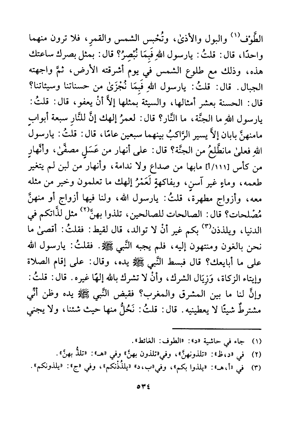 الطَّوْف (¬١) والبول والأذى، وتُحْبس الشمس والقمرِ، فلا ترون منهما واحدًا، قال: قلتُ: يا رسول اللَّهِ فَبِمَا نُبْصِرُ؟ قال: بمثل بصرك ساعتك هذه، وذلك مع طلوع الشمس في يوم أشرقته الأرض، ثمَّ واجهته الجبال. قال: قلتُ: يا رسول اللَّهِ فَبمَا نُجْزَى من حسناتنا وسيئاتنا؟ قال: الحسنة بعشر أمثالها، والسيئة بمثلها إلَّا أنْ يعفو، قال: قلتُ: يا رسول اللَّهِ ما الجنَّة، ما النَّار؟ قال: لعمرُ إلهك إنَّ للنَّارِ سبعة أبوابٍ ما منهنَّ بابان إلَّا يسير الرَّاكبُ بينهما سبعين عامًا، قال: قلتُ: يا رسول اللَّهِ فعلى ما نطَّلِعُ من الجنَّة؟ قال: على أنهار من عَسَلٍ مصفَّى، وأنَّهارٍ من كأس ما بها من صداع ولا ندامة، وأنهار من لبن لم يتغير طعمه، وماءٍ غير آسنٍ، وبفاكهةٍ لَعَمْرُ إلهك ما تعلمون وخير من مثله معه، وأزواج مطهرة، قلتُ: يا رسول اللَّه، ولنا فيها أزواج أو منهنَّ مُصْلحات؟ قال: الصالحات للصالحين، تلذوا بهنَّ (¬٢) مثل لذَّاتكم في الدنيا، ويلذذن (¬٣) بكم غير أنْ لا توالد، قال لقيط: فقلتُ: أقصى ما نحن بالغون ومنتهون إليه، فلم يجبه النَّبي -صلى اللَّه عليه وسلم-. فقلتُ: يا رسول اللَّه على ما أبايعك؟ قال فبسط النَّبي -صلى اللَّه عليه وسلم- يده، وقال: على إقام الصلاة وإيتاء الزكاة، وَزِيَال الشرك، وأنْ لا تشرك باللَّه إلهًا غيره. قال: قلتُ: وإنَّ لنا ما بين المشرق والمغرب؟ فقبض النَّبي -صلى اللَّه عليه وسلم- يده وظن أنِّي مشترطٌ شيئًا لا يعطينيه. قال: قلتُ: نَحُلُّ منها حيث شئنا، ولا يجني