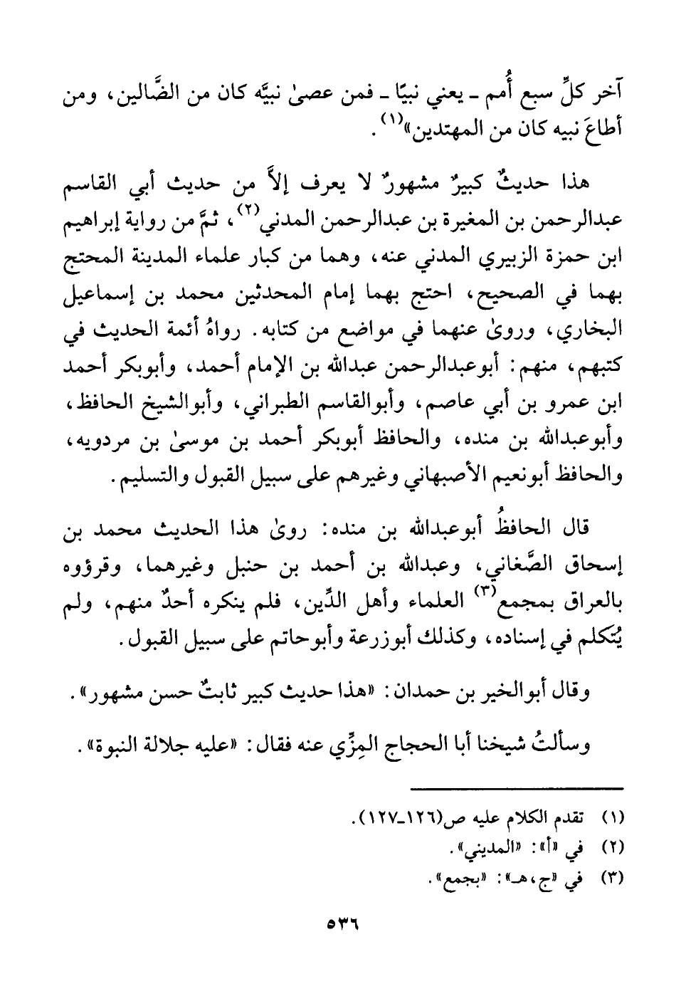 هذا حديثٌ كبيرٌ مشهورٌ لا يعرف إلَّا من حديث أبي القاسم عبد الرحمن بن المغيرة بن عبد الرحمن المدني (¬٢) ، ثمَّ من رواية إبراهيم ابن حمزة الزبيري المدني عنه، وهما من كبار علماء المدينة المحتج بهما في الصحيح، احتج بهما إمام المحدثين محمد بن إسماعيل البخاري، وروى عنهما في مواضع من كتابه. رواهُ أئمة الحديث في كتبهم، منهم: أبو عبد الرحمن عبد اللَّه بن الإمام أحمد، وأبو بكر أحمد ابن عمرو بن أبي عاصم، وأبو القاسم الطبراني، وأبو الشيخ الحافظ، وأبو عبد اللَّه بن منده، والحافظ أبو بكر أحمد بن موسى بن مردويه، والحافظ أبو نعيم الأصبهاني وغيرهم على سبيل القبول والتسليم.