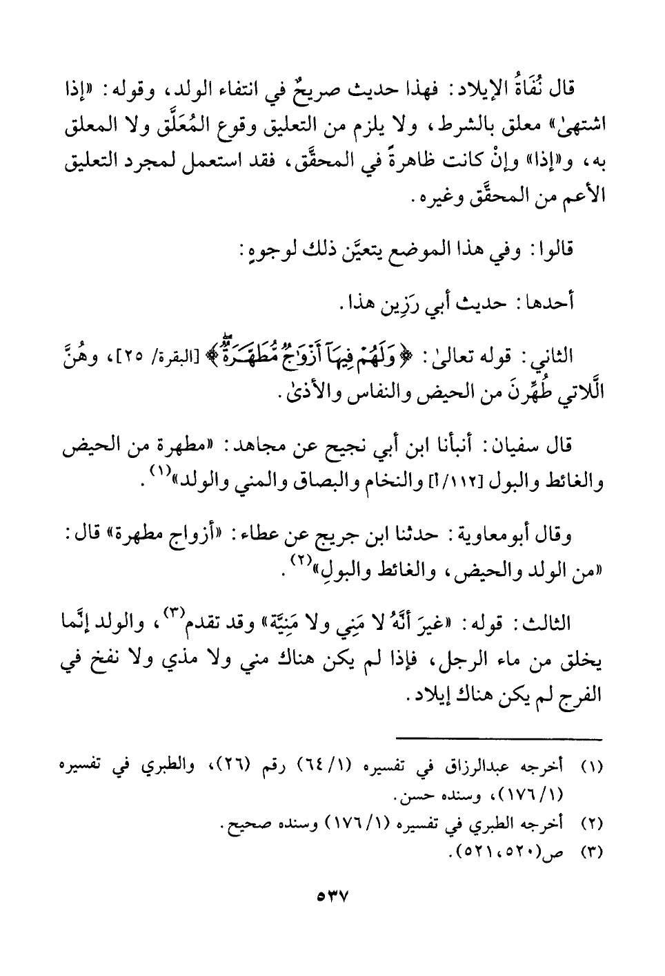 قال سفيان: أنبأنا ابن أبي نجيح عن مجاهد: "مطهرة من الحيض والغائط والبول والنخام والبصاق والمني والولد" (¬١) .
