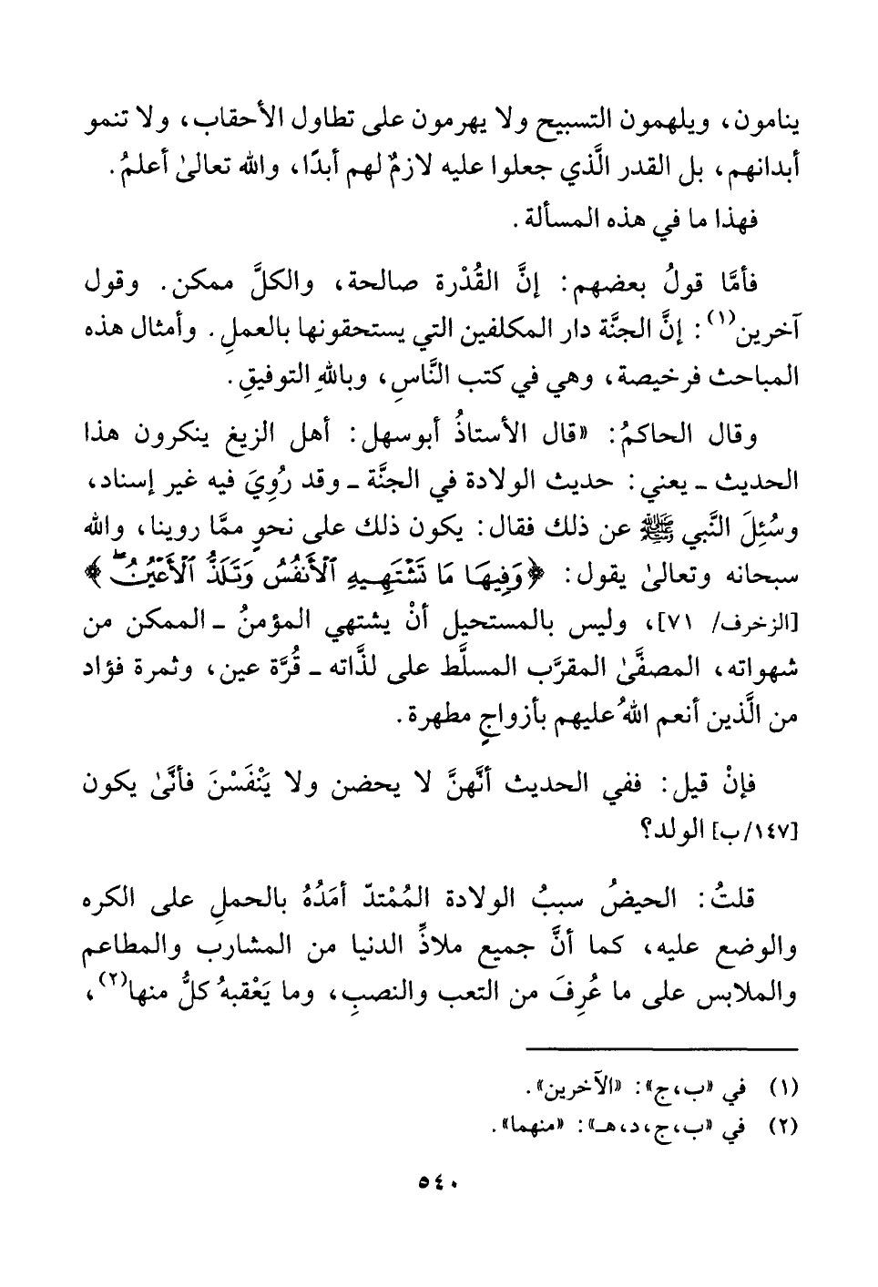 وقال الحاكمُ: "قال الأستاذُ أبو سهل: أهل الزيغ ينكرون هذا الحديث -يعني: حديث الولادة في الجنَّة - وقد رُوِيَ فيه غير إسناد، وسُئِلَ النَّبي -صلى اللَّه عليه وسلم- عن ذلك فقال: يكون ذلك على نحوٍ ممَّا روينا، واللَّه سبحانه وتعالى يقول: {وَفِيهَا مَا تَشْتَهِيهِ الْأَنْفُسُ وَتَلَذُّ الْأَعْيُنُ} [الزخرف: ٧١]، وليس بالمستحيل أنْ يشتهي المؤمنُ - الممكن من شهواته، المصفَّى المقرَّب المسلَّط على لذَّاته - قُرَّة عين، وثمرة فؤاد من الَّذين أنعم اللَّهُ عليهم بأزواجٍ مطهرة.