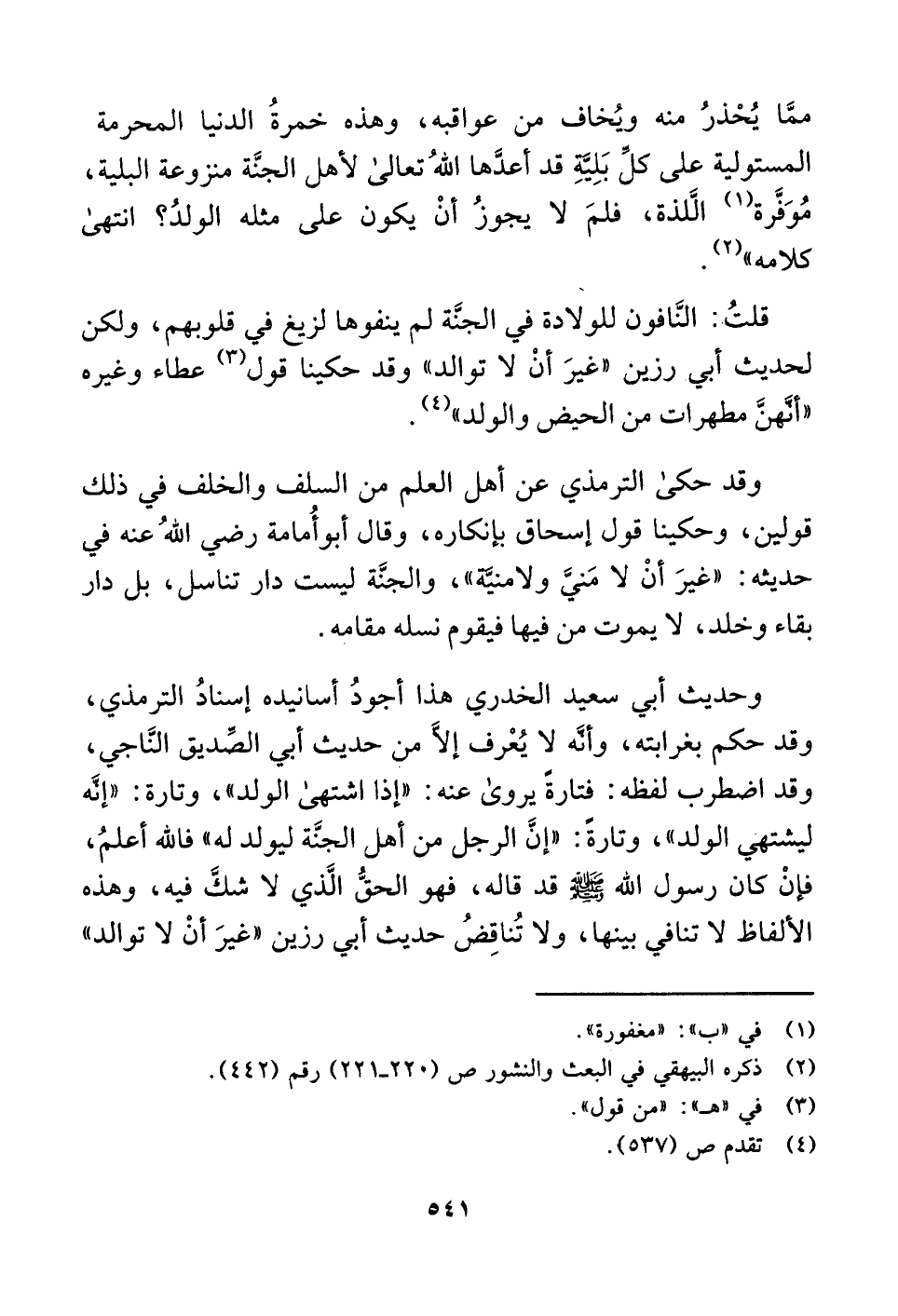 قلتُ: النَّافون للولادة في الجنَّة لم ينفوها لزيغ في قلوبهم، ولكن لحديث أبي رزين "غيرَ أنْ لا توالد" وقد حكينا قول (¬٣) عطاء وغيره "أنَّهنَّ مطهرات من الحيض والولد" (¬٤) .