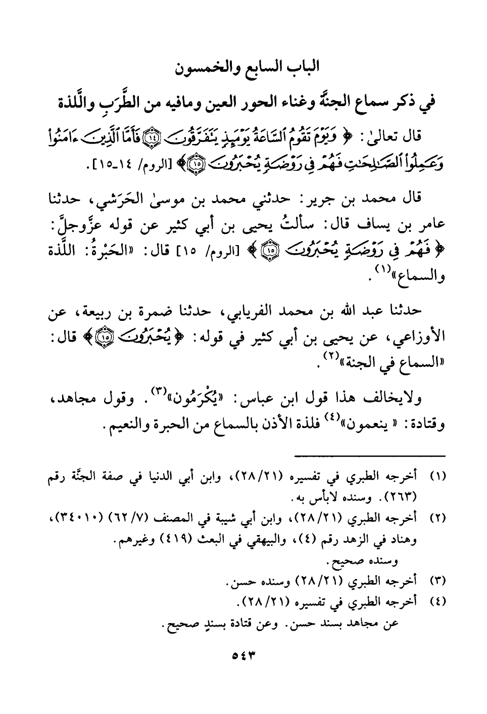 قال تعالى: {وَيَوْمَ تَقُومُ السَّاعَةُ يَوْمَئِذٍ يَتَفَرَّقُونَ (١٤) فَأَمَّا الَّذِينَ آمَنُوا وَعَمِلُوا الصَّالِحَاتِ فَهُمْ فِي رَوْضَةٍ يُحْبَرُونَ (١٥)} [الروم: ١٤ - ١٥].