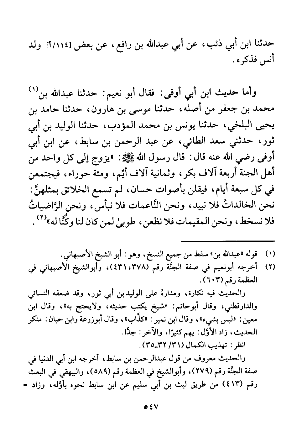 وأما حديث ابن أبي أوفى: فقال أبو نعيم: حدثنا عبد اللَّه بن (¬١) محمد بن جعفر من أصله، حدثنا موسى بن هارون، حدثنا حامد بن يحيى البلخي، حدثنا يونس بن محمد المؤدب، حدثنا الوليد بن أبي ثور، حدثني سعد الطائي، عن عبد الرحمن بن سابط، عن ابن أبي أوفى رضي اللَّه عنه قال: قال رسول اللَّه -صلى اللَّه عليه وسلم-: "يزوج إلى كل واحد من أهل الجنة أربعة آلاف بكر، وثمانية آلاف أيِّم، ومئة حوراء، فيجتمعن في كل سبعة أيام، فيقلن بأصوات حسان، لم تسمع الخلائق بمثلهنَّ: نحن الخالداتُ فلا نبيد، ونحن النَّاعمات فلا نبأس، ونحن الرَّاضياتُ فلا نسخط، ونحن المقيمات فلا نظعن، طوبى لمن كان لنا وكُنَّا له" (¬٢) .