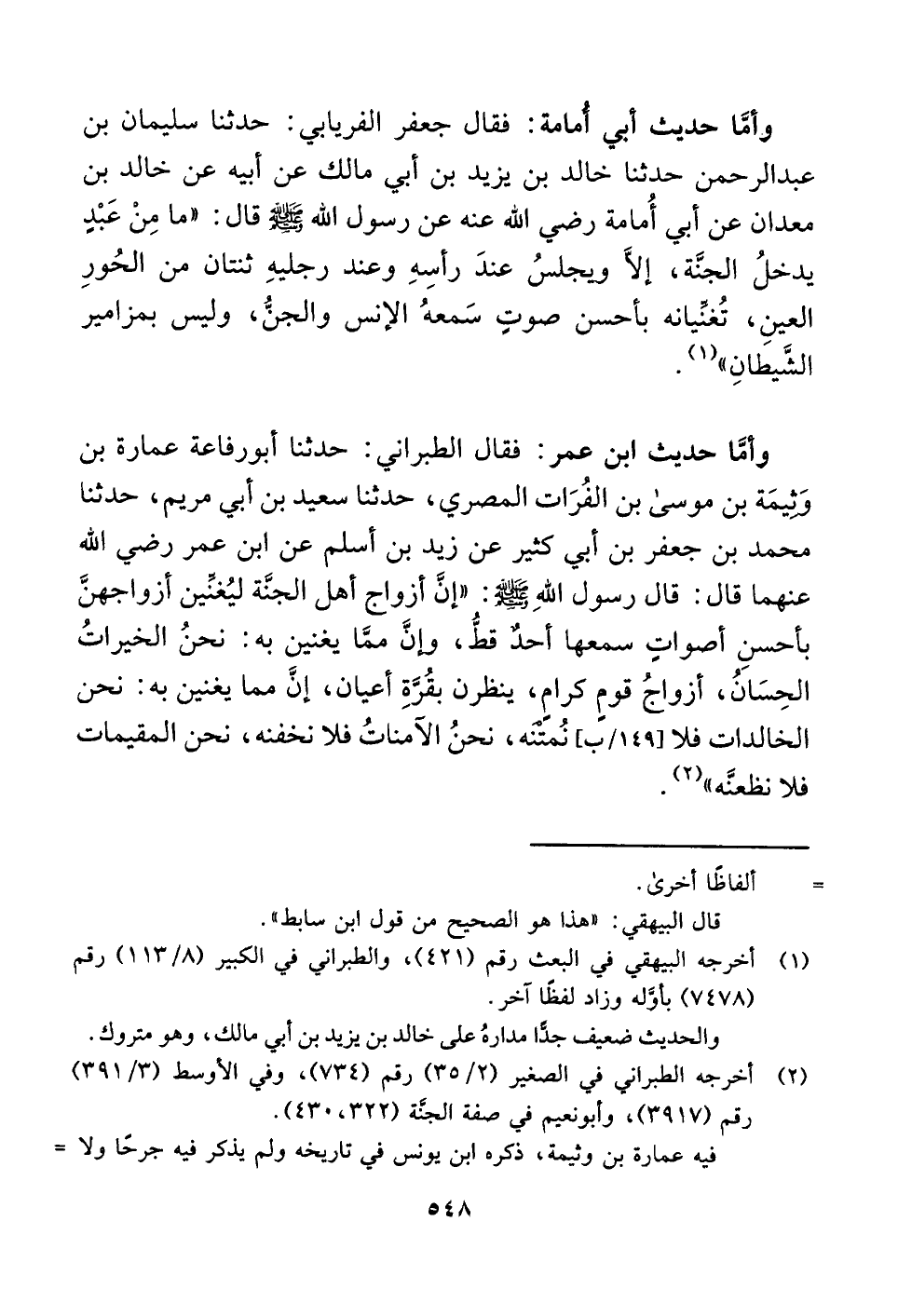 وأمَّا حديث أبي أُمامة: فقال جعفر الفريابي: حدثنا سليمان بن عبد الرحمن حدثنا خالد بن يزيد بن أبي مالك عن أبيه عن خالد بن معدان عن أبي أُمامة رضي اللَّه عنه عن رسول اللَّه -صلى اللَّه عليه وسلم- قال: "ما مِنْ عَبْدٍ يدخلُ الجنَّة، إلَّا ويجلسُ عندَ رأسِهِ وعند رجليهِ ثنتان من الحُورِ العينِ، تُغنِّيانه بأحسن صوتٍ سَمعهُ الإنس والجنُّ، وليس بمزامير الشَّيطانِ" (¬١) .