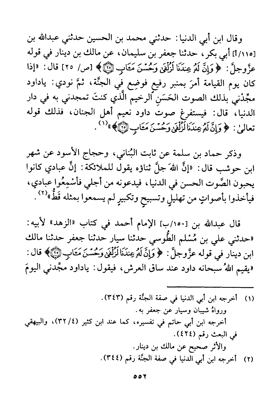 قال عبد اللَّه بن الإمام أحمد في كتاب "الزهد" لأبيه: "حدثني علي بن مُسْلم الطُّوسي حدثنا سيار حدثنا جعفر حدثنا مالك ابن دينار في قوله عزَّ وجلَّ: {وَإِنَّ لَهُ عِنْدَنَا لَزُلْفَى وَحُسْنَ مَآبٍ (٢٥) } قال: "يقيم اللَّهُ سبحانه داود عند ساق العرش، فيقول: يا داود مجِّدني اليومَ