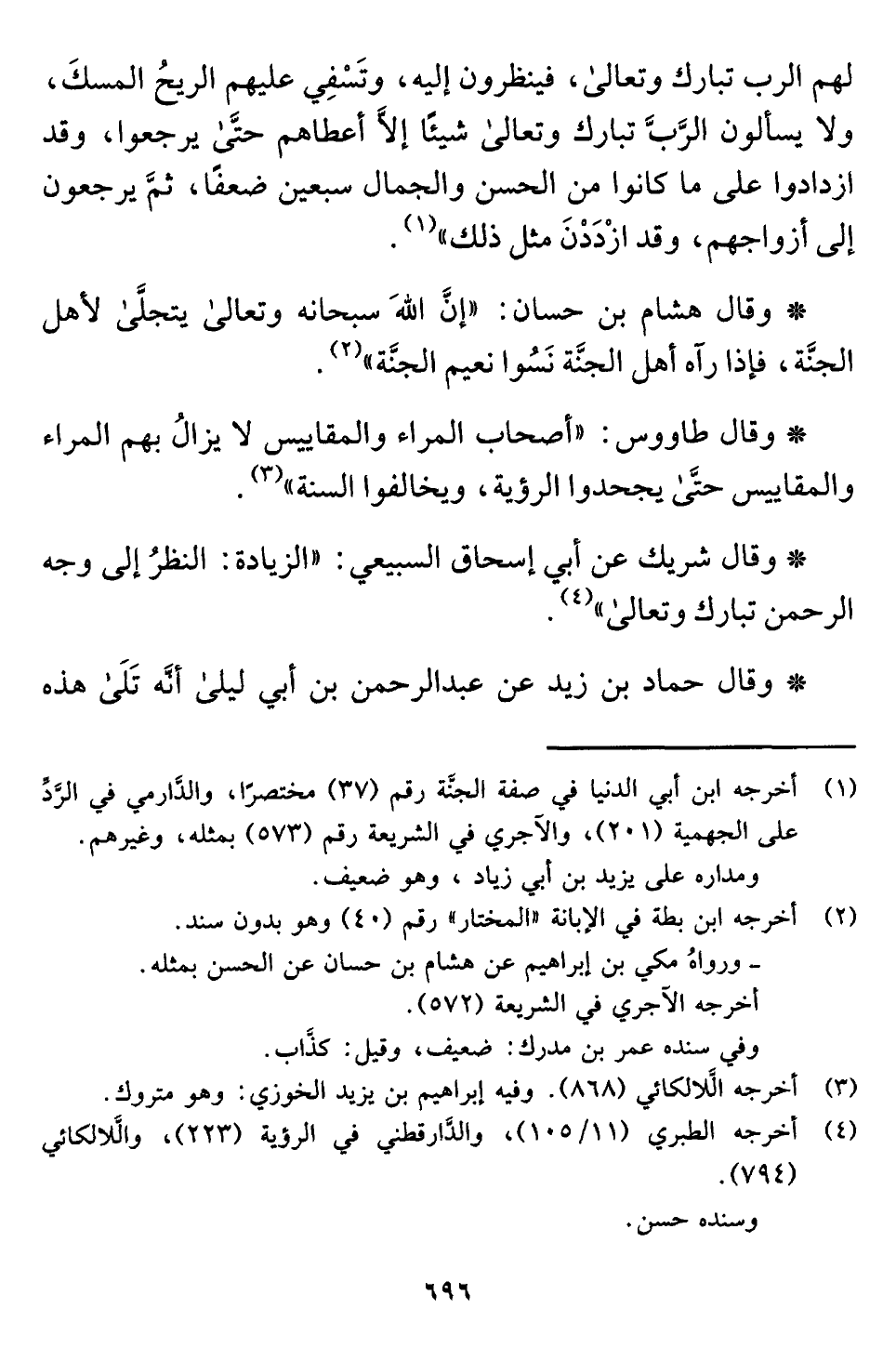 * وقال هشام بن حسان: "إنَّ اللَّهَ سبحانه وتعالى يتجلَّى لأهل الجنَّة، فإذا رآه أهل الجنَّة نَسُوا نعيم الجنَّة" (¬٢) .
