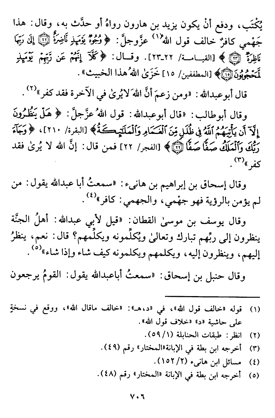 وقال يوسف بن موسى القطان: "قيل لأبي عبد اللَّه: أهلُ الجنَّة ينظرون إلى ربِّهم تبارك وتعالى ويُكلَّمونه ويكلِّمهم؟ قال: نعم، ينظرُ إليهم، وينظرون إليه، ويكلمهم ويكلمونه كيف شاء وإذا شاء" (¬٥) .