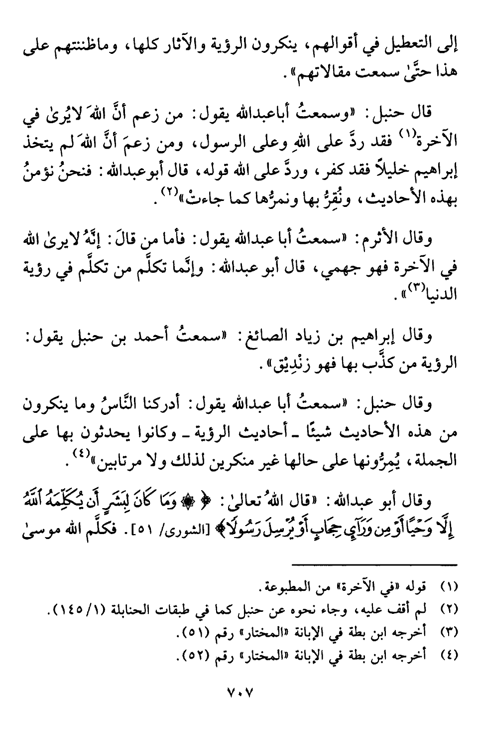 وقال إبراهيم بن زياد الصائغ: "سمعتُ أحمد بن حنبل يقول: الرؤية من كذَّب بها فهو زنْدِيْق".