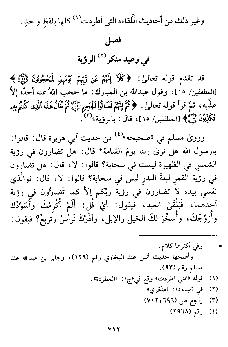 قد تقدم قوله تعالى: {كَلَّا إِنَّهُمْ عَنْ رَبِّهِمْ يَوْمَئِذٍ لَمَحْجُوبُونَ (١٥)} [المطففين: ١٥]، وقول عبد اللَّه بن المبارك: ما حجب اللَّهُ عنه أحدًا إلَّا عذَّبه، ثمَّ قرأ قوله تعالى: {ثُمَّ إِنَّهُمْ لَصَالُو الْجَحِيمِ (١٦) ثُمَّ يُقَالُ هَذَا الَّذِي كُنْتُمْ بِهِ تُكَذِّبُونَ (١٧)} [المطففين: ١٦ - ١٧]، قال: بالرؤية" (¬٣).