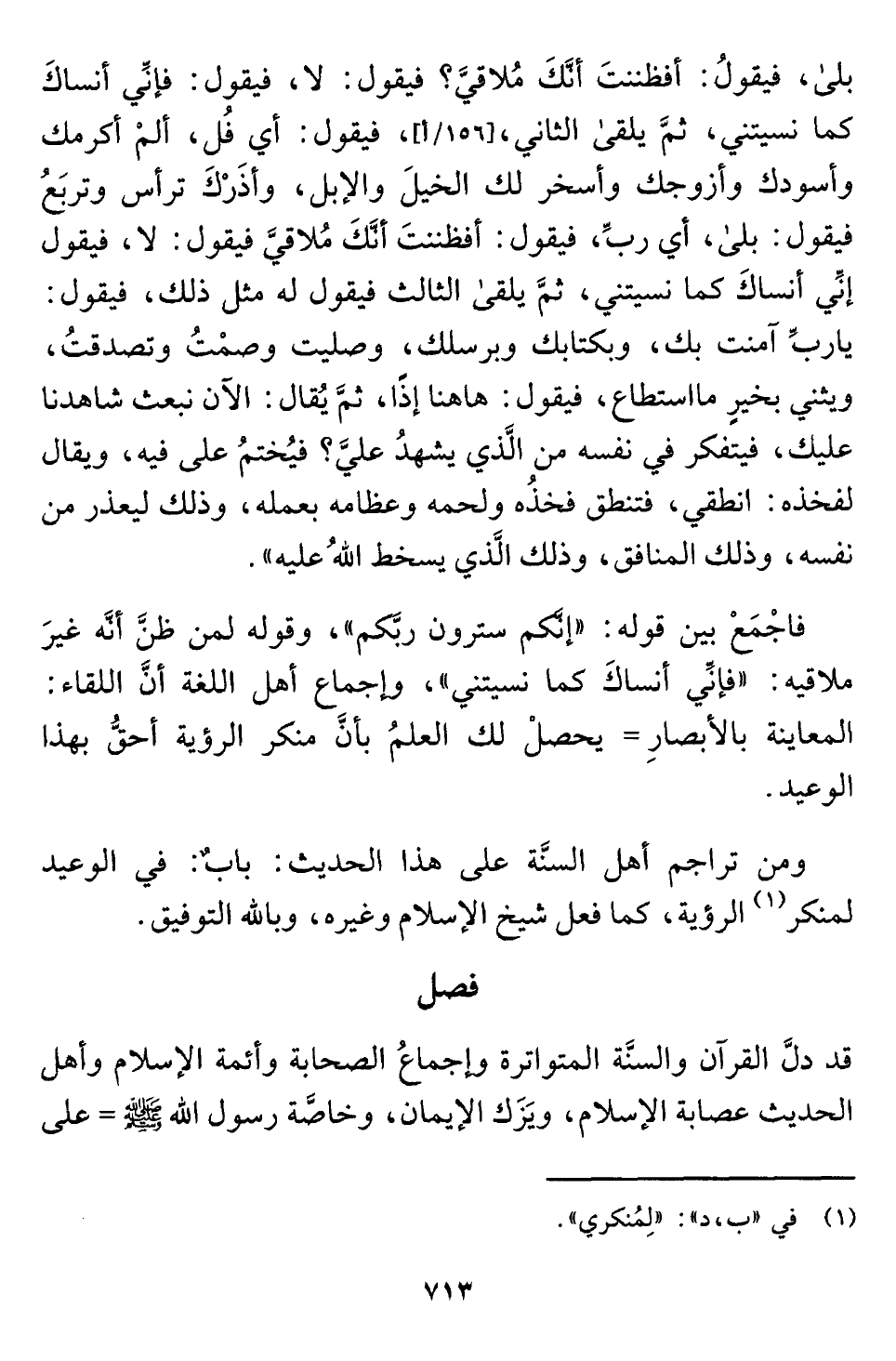 فاجْمَعْ بين قوله: "إنَّكم سترون ربَّكم"، وقوله لمن ظنَّ أنَّه غيرَ ملاقيه: "فإنِّي أنساكَ كما نسيتني"، وإجماع أهل اللغة أنَّ اللقاء: المعاينة بالأبصارِ = يحصلْ لك العلمُ بأنَّ منكر الرؤية أحقُّ بهذا الوعيد.
