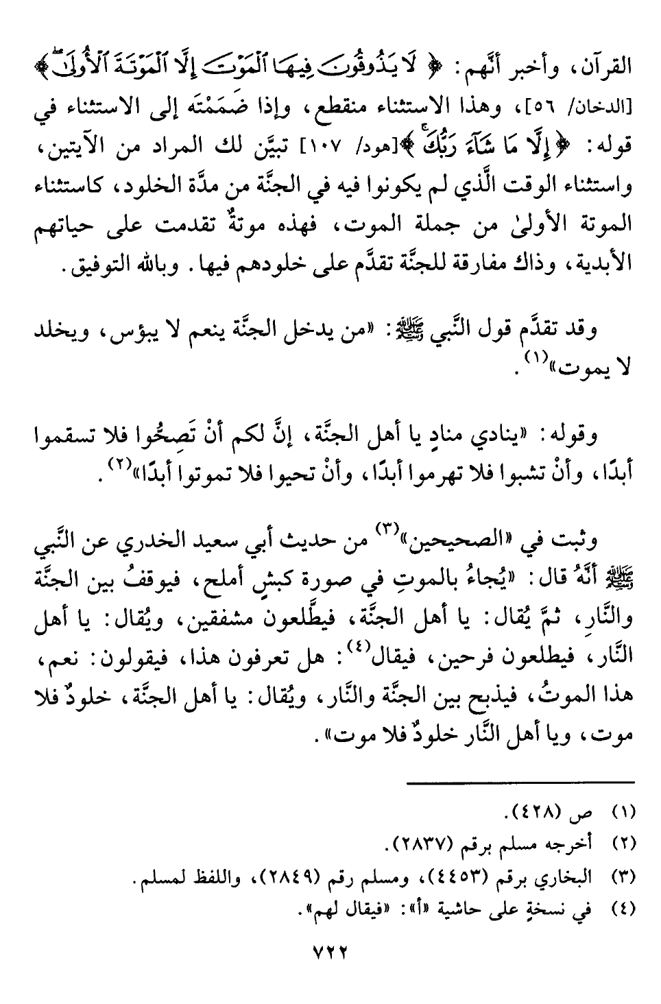 وثبت في "الصحيحين" (¬٣) من حديث أبي سعيد الخدري عن النَّبي -صلى اللَّه عليه وسلم- قال: "يُجاءُ بالموتِ في صورة كبشٍ أملح، فيوقفُ بين الجنَّة والنَّارِ، ثمَّ يُقال: يا أهل الجنَّة، فيطَّلعون مشفقين، ويُقال: يا أهل النَّار، فيطلعون فرحين، فيقال (¬٤) : هل تعرفون هذا، فيقولون: نعم، هذا الموتُ، فيذبح بين الجنَّة والنَّار، ويُقال: يا أهل الجنَّة، خلودٌ فلا موت، ويا أهل النَّار خلودٌ فلا موت".