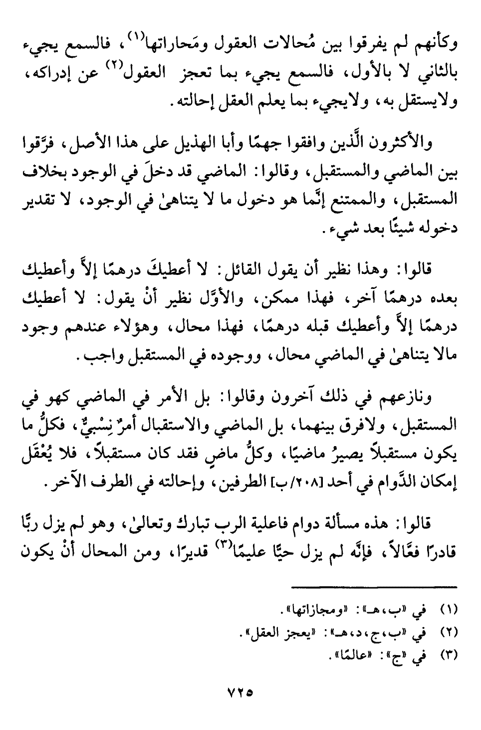 ونازعهم في ذلك آخرون وقالوا: بل الأمر في الماضي كهو في المستقبل، ولا فرق بينهما، بل الماضي والاستقبال أمرٌ نِسْبيٌّ، فكلُّ ما يكون مستقبلًا يصيرُ ماضيًا، وكلُّ ماضٍ فقد كان مستقبلًا، فلا يُعْقَل إمكان الدَّوام في أحد الطرفين، وإحالته في الطرف الآخر.