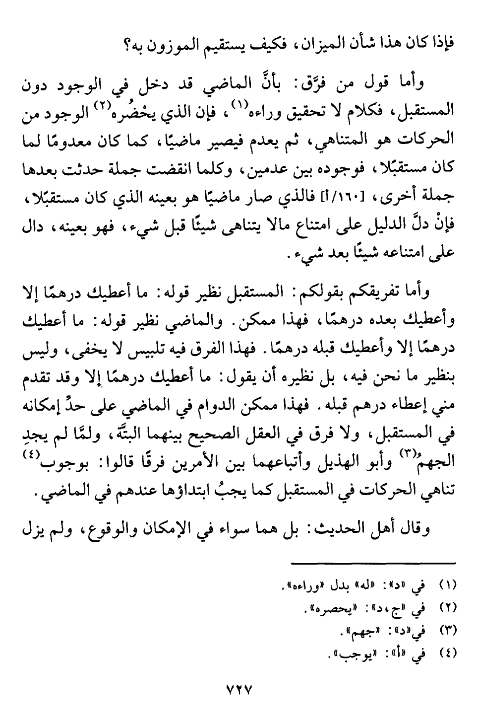 وأما تفريقكم بقولكم: المستقبل نظير قوله: ما أعطيك درهمًا إلا وأعطيك بعده درهمًا، فهذا ممكن. والماضي نظير قوله: ما أعطيك درهمًا إلا وأعطيك قبله درهمًا. فهذا الفرق فيه تلبيس لا يخفى، وليس بنظير ما نحن فيه، بل نظيره أن يقول: ما أعطيك درهمًا إلا وقد تقدم مني إعطاء درهم قبله. فهذا ممكن الدوام في الماضي على حدِّ إمكانه في المستقبل، ولا فرق في العقل الصحيح بينهما البتَّة، ولمَّا لم يجدِ الجهمُ (¬٣) وأبو الهذيل وأتباعهما بين الأمرين فرقًا قالوا: بوجوب (¬٤) تناهي الحركات في المستقبل كما يجبُ ابتداؤها عندهم في الماضي.