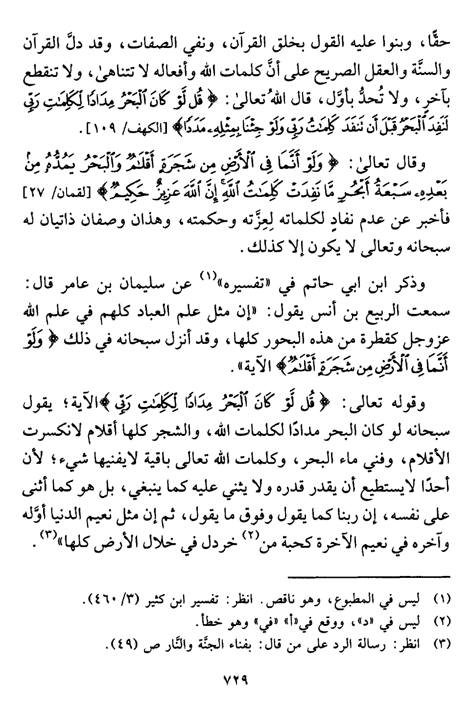 وقال تعالى: {وَلَوْ أَنَّمَا فِي الْأَرْضِ مِنْ شَجَرَةٍ أَقْلَامٌ وَالْبَحْرُ يَمُدُّهُ مِنْ بَعْدِهِ سَبْعَةُ أَبْحُرٍ مَا نَفِدَتْ كَلِمَاتُ اللَّهِ إِنَّ اللَّهَ عَزِيزٌ حَكِيمٌ} [لقمان: ٢٧] فأخبر عن عدم نفادٍ لكلماته لِعِزَّته وحكمته، وهذان وصفان ذاتيان له سبحانه وتعالى لا يكون إلا كذلك.