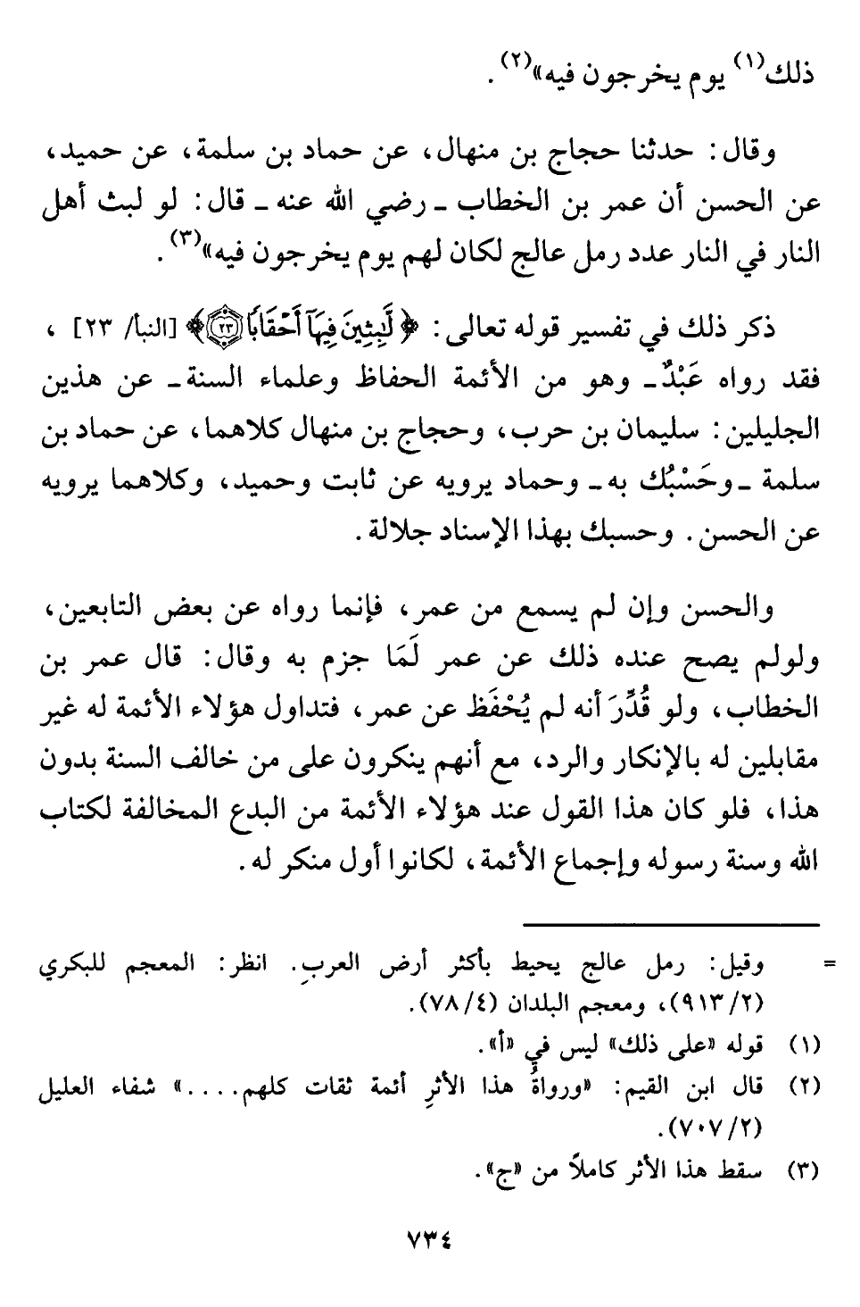وقال: حدثنا حجاج بن منهال، عن حماد بن سلمة، عن حميد، عن الحسن أن عمر بن الخطاب -رضي اللَّه عنه- قال: لو لبث أهل النار في النار عدد رمل عالج لكان لهم يوم يخرجون فيه" (¬٣) .