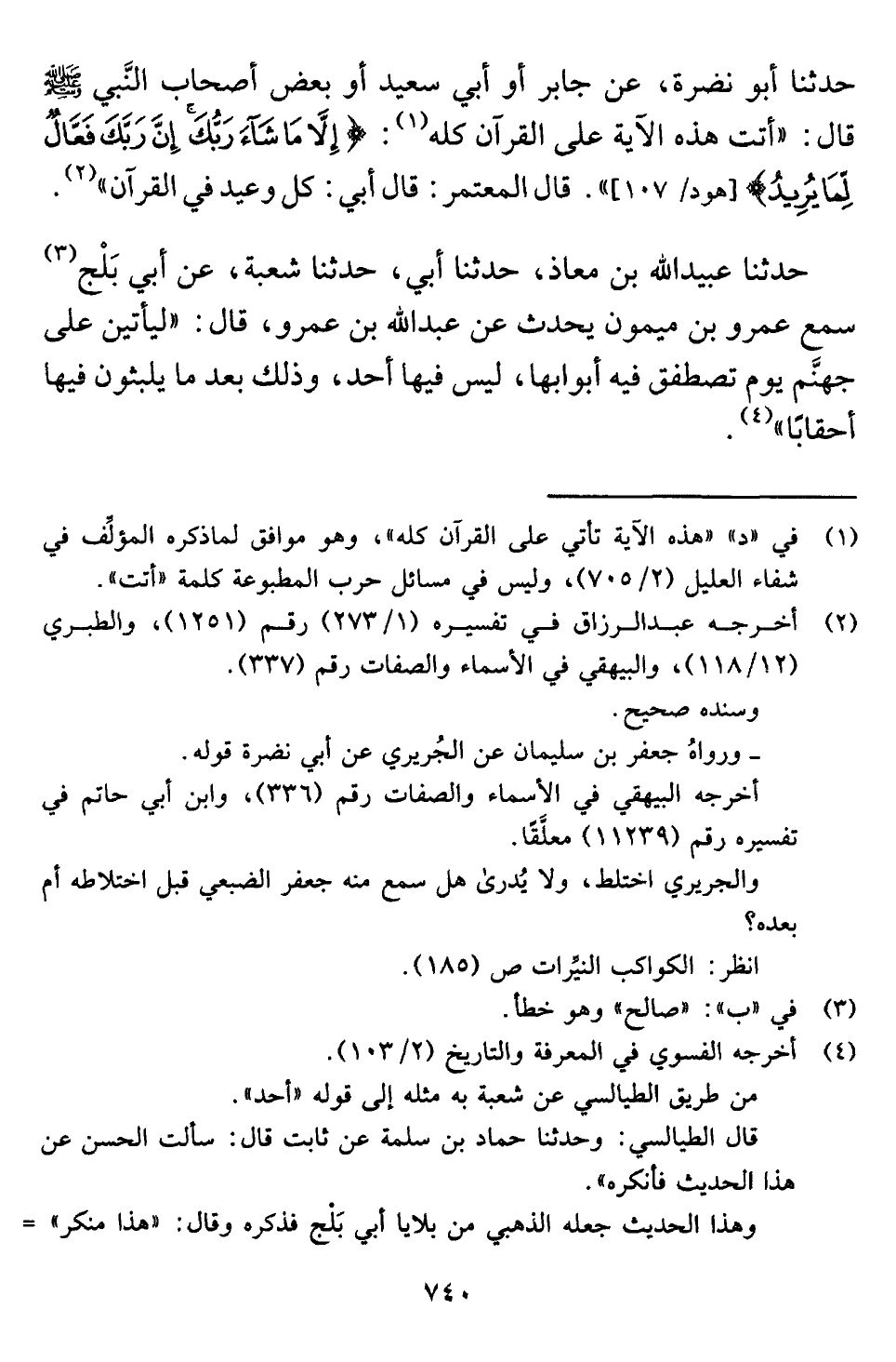 حدثنا أبو نضرة، عن جابر أو أبي سعيد أو بعض أصحاب النَّبي -صلى اللَّه عليه وسلم- قال: "أتت هذه الآية على القرآن كله (¬١) : {إِلَّا مَا شَاءَ رَبُّكَ إِنَّ رَبَّكَ فَعَّالٌ لِمَا يُرِيدُ} [هود: ١٠٧] ". قال المعتمر: قال أبي: كل وعيد في القرآن" (¬٢) .