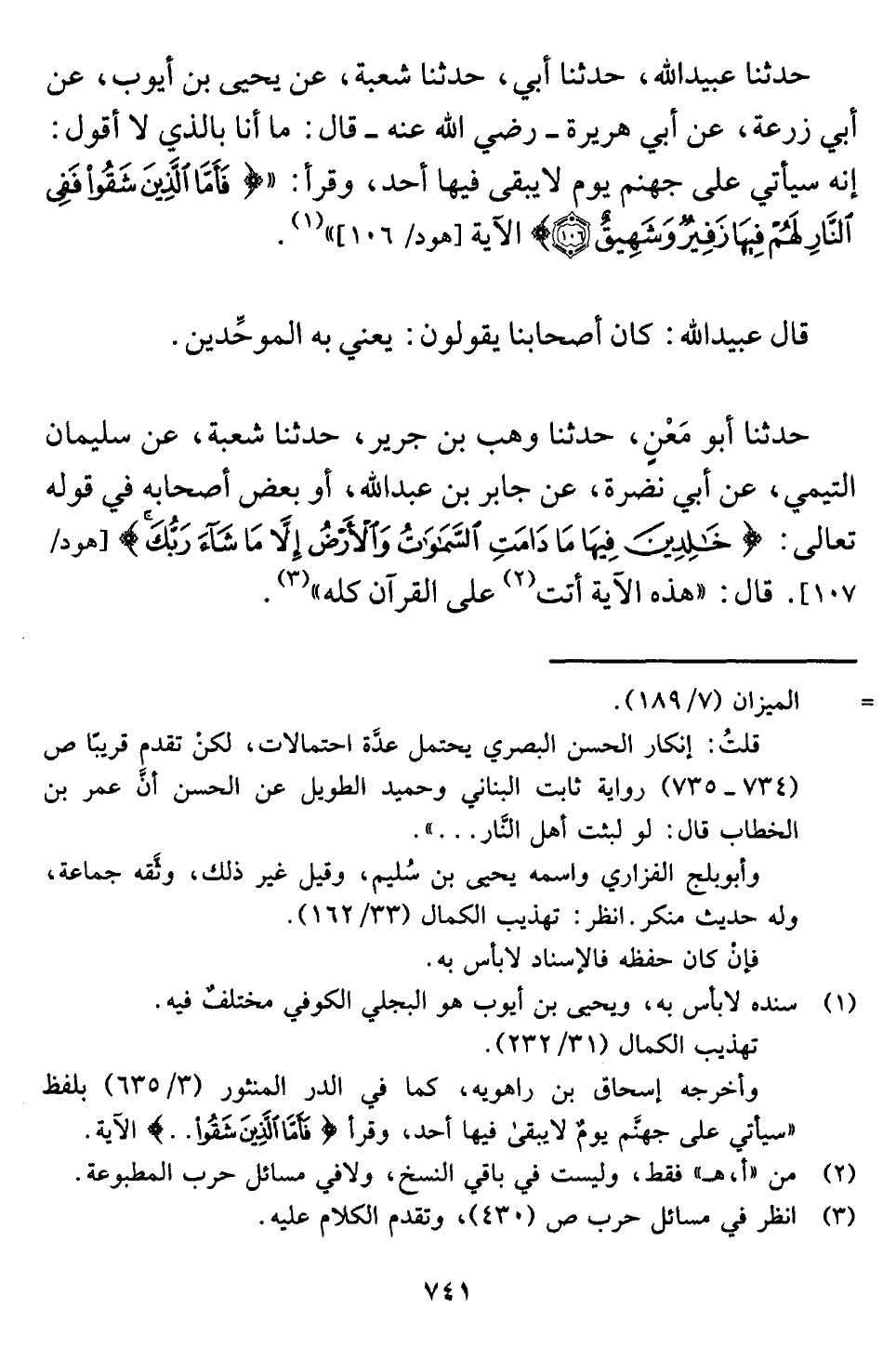 حدثنا عبيد اللَّه، حدثنا أبي، حدثنا شعبة، عن يحيى بن أيوب، عن أبي زرعة، عن أبي هريرة -رضي اللَّه عنه- قال: ما أنا بالذي لا أقول: إنه سيأتي على جهنم يوم لا يبقى فيها أحد، وقرأ: " {فَأَمَّا الَّذِينَ شَقُوا فَفِي النَّارِ لَهُمْ فِيهَا زَفِيرٌ وَشَهِيقٌ (١٠٦) } [هود: ١٠٦] " (¬١) .