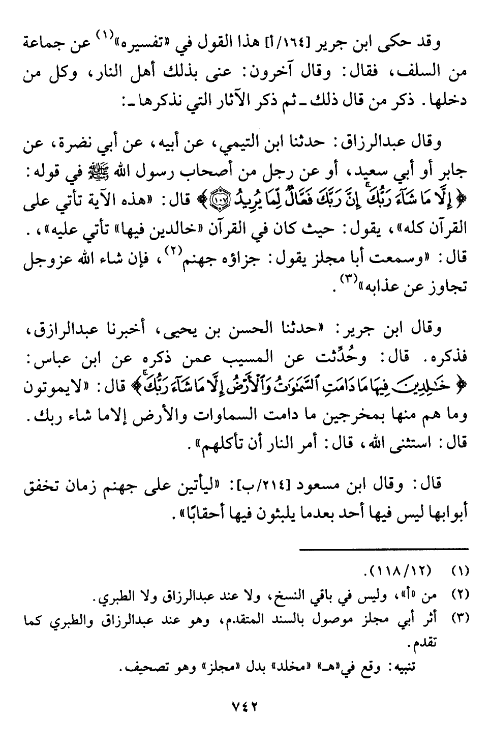 وقال ابن جرير: "حدثنا الحسن بن يحيى، أخبرنا عبد الرازق، فذكره. قال: وحُدِّثت عن المسيب عمن ذكره عن ابن عباس: {خَالِدِينَ فِيهَا مَا دَامَتِ السَّمَاوَاتُ وَالْأَرْضُ إِلَّا مَا شَاءَ رَبُّكَ} قال: "لا يموتون وما هم منها بمخرجين ما دامت السماوات والأرض إلا ما شاء ربك. قال: استثنى اللَّه، قال: أمر النار أن تأكلهم".