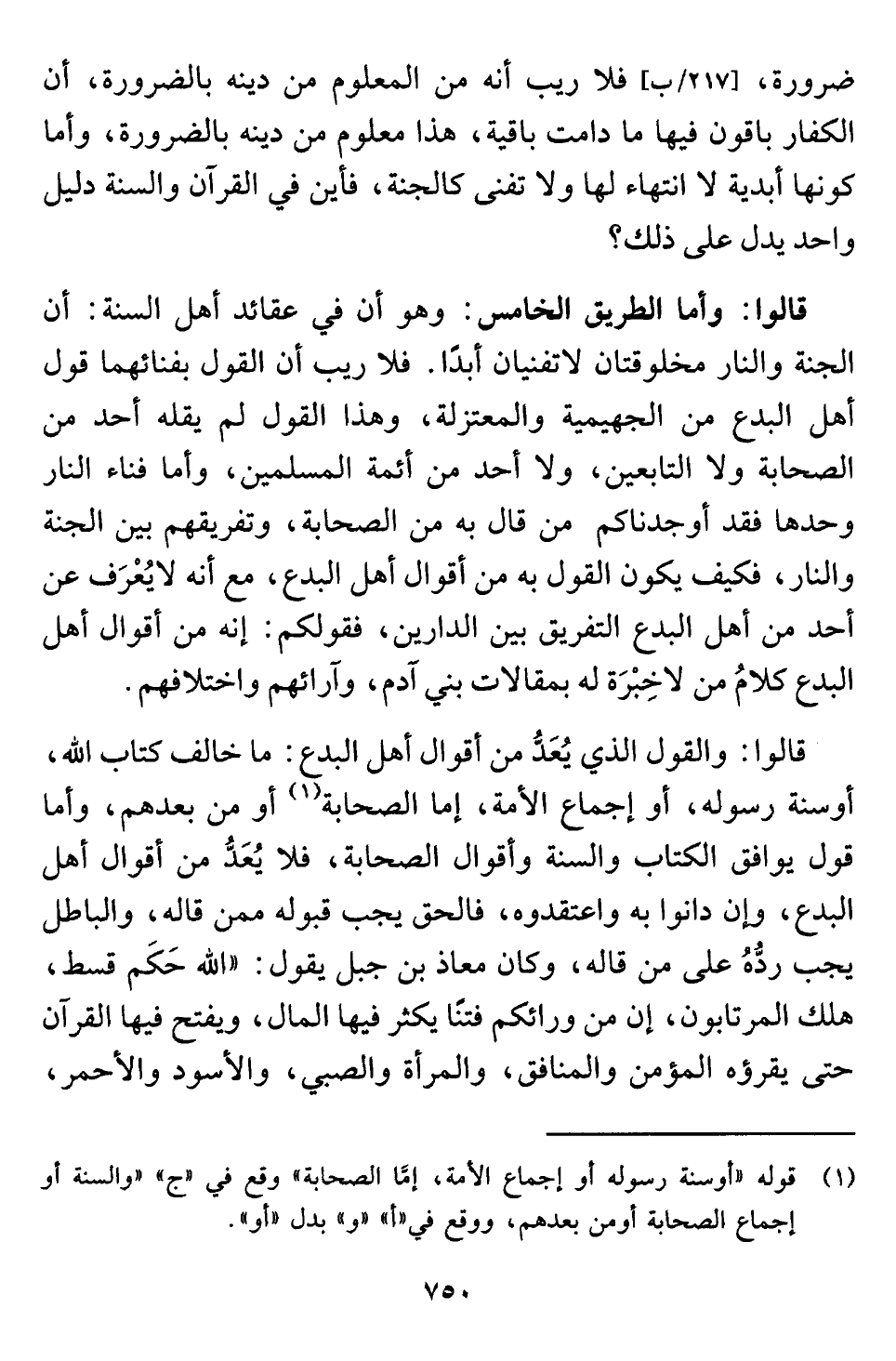 قالوا: وأما الطريق الخامس: وهو أن في عقائد أهل السنة: أن الجنة والنار مخلوقتان لا تفنيان أبدًا. فلا ريب أن القول بفنائهما قول أهل البدع من الجهيمية والمعتزلة، وهذا القول لم يقله أحد من الصحابة ولا التابعين، ولا أحد من أئمة المسلمين، وأما فناء النار وحدها فقد أوجدناكم من قال به من الصحابة، وتفريقهم بين الجنة والنار، فكيف يكون القول به من أقوال أهل البدع، مع أنَّه لا يُعْرَف عن أحد من أهل البدع التفريق بين الدارين، فقولكم: إنه من أقوال أهل البدع كلامُ من لا خِبْرَة له بمقالات بني آدم، وآرائهم واختلافهم.