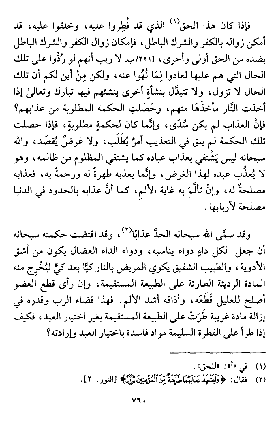وقد سمَّى اللَّه سبحانه الحدَّ عذابًا (¬٢) ، وقد اقتضت حكمته سبحانه أن جعل لكل داءٍ دواء يناسبه، ودواء الداء العضال يكون من أشق الأدوية، والطبيب الشفيق يكوي المريض بالنار كيًّا بعد كيٍّ ليُخْرِج منه المادة الرديئة الطارئة على الطبيعة المستقيمة، وإن رأى قطع العضو أصلح للعليل قَطَعَه، وأذاقه أشد الألم. فهذا قضاء الرب وقدره في إزالة مادة غريبة طَرَتْ على الطبيعة المستقيمة بغير اختيار العبد، فكيف إذا طرأ على الفطرة السليمة مواد فاسدة باختيار العبد وإرادته؟