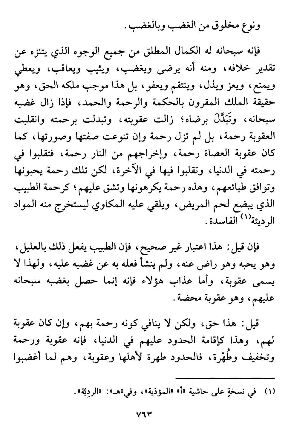 فإنَّه سبحانه له الكمال المطلق من جميع الوجوه الذي يتنزه عن تقدير خلافه، ومنه أنَّه يرضى ويغضب، ويثيب ويعاقب، ويعطي ويمنع، ويعز ويذل، وينتقم ويعفو، بل هذا موجب ملكه الحق، وهو حقيقة الملك المقرون بالحكمة والرحمة والحمد، فإذا زال غضبه سبحانه، وتَبَدَّلَ برضاه؛ زالت عقوبته، وتبدلت برحمته وانقلبت العقوبة رحمة، بل لم تزل رحمة وإن تنوعت صفتها وصورتها، كما كان عقوبة العصاة رحمة، وإخراجهم من النار رحمة، فتقلبوا في رحمته في الدنيا، وتقلبوا فيها في الآخرة، لكن تلك رحمة يحبونها وتوافق طبائعهم، وهذه رحمة يكرهونها وتشق عليهم؛ كرحمة الطبيب الذي يبضع لحم المريض، ويلقي عليه المكاوي ليستخرج منه المواد الرديئة (¬١) الفاسدة.