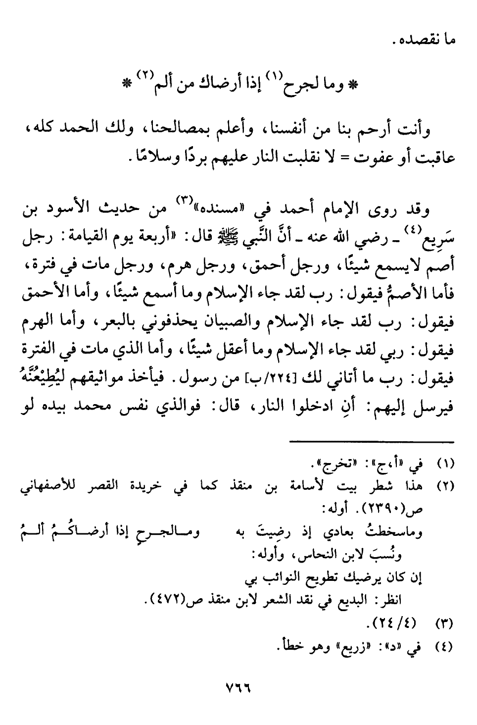 وقد روى الإمام أحمد في "مسنده" (¬٣) من حديث الأسود بن سَرِيع (¬٤) -رضي اللَّه عنه- أنَّ النَّبي -صلى اللَّه عليه وسلم- قال: "أربعة يوم القيامة: رجل أصم لا يسمع شيئًا، ورجل أحمق، ورجل هرم، ورجل مات في فترة، فأما الأصمُّ فيقول: رب لقد جاء الإِسلام وما أسمع شيئًا، وأما الأحمق فيقول: رب لقد جاء الإِسلام والصبيان يحذفوني بالبعر، وأما الهرم فيقول: ربي لقد جاء الإِسلام وما أعقل شيئًا، وأما الذي مات في الفترة فيقول: رب ما أتاني لك من رسول. فيأخذ مواثيقهم ليُطِيْعُنَّهُ فيرسل إليهم: أنِ ادخلوا النار، قال: فوالذي نفس محمَّد بيده لو