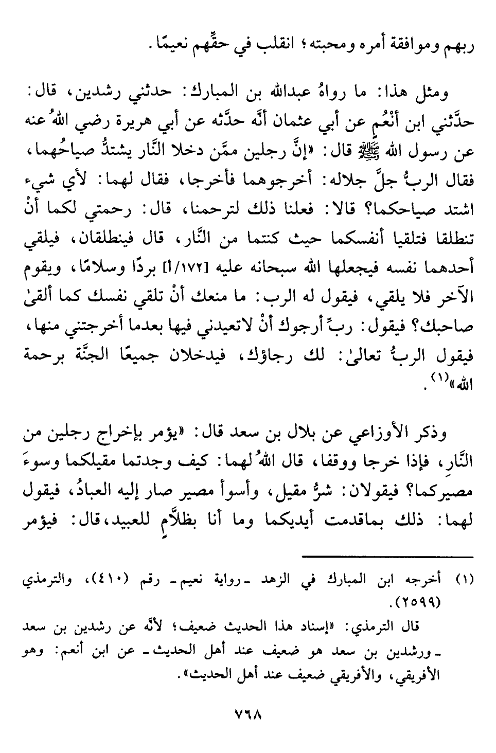 ومثل هذا: ما رواهُ عبد اللَّه بن المبارك: حدثني رشدين، قال: حدَّثني ابن أنْعُمٍ عن أبي عثمان أنَّه حدَّثه عن أبي هريرة رضي اللَّهُ عنه عن رسول اللَّه -صلى اللَّه عليه وسلم- قال: "إنَّ رجلين ممَّن دخلا النَّار يشتدُّ صياحُهما، فقال الربُّ جلَّ جلاله: أخرجوهما فأخرجا، فقال لهما: لأي شيء اشتد صياحكما؟ قالا: فعلنا ذلك لترحمنا، قال: رحمتي لكما أنْ تنطلقا فتلقيا أنفسكما حيث كنتما من النَّار، قال فينطلقان، فيلقي أحدهما نفسه فيجعلها اللَّه سبحانه عليه بردًا وسلامًا، ويقوم الآخر فلا يلقي، فيقول له الرب: ما منعك أنْ تلقي نفسك كما ألقى صاحبك؟ فيقول: ربِّ أرجوك أنْ لا تعيدني فيها بعدما أخرجتني منها، فيقول الربُّ تعالى: لك رجاؤك، فيدخلان جميعًا الجنَّة برحمة اللَّه" (¬١) .