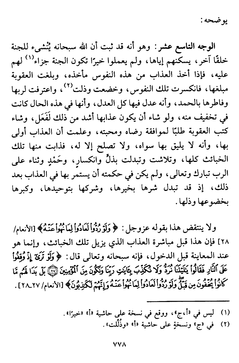 الوجه التاسع عشر: وهو أنَّه قد ثبت أن اللَّه سبحانه يُنْشئ للجنة خلقًا آخر، يسكنهم إياها، ولم يعملوا خيرًا تكون الجنة جزاء (¬١) لهم عليه، فإذا أخذ العذاب من هذه النفوس مأخذه، وبلغت العقوبة مبلغها، فانكسرت تلك النفوس، وخضعت وذلت (¬٢) ، واعترفت لربها وفاطرها بالحمد، وأنه عدل فيها كل العدل، وأنها في هذه الحال كانت في تخفيف منه، ولو شاء أن يكون عذابها أشد من ذلك لَفَعَل، وشاء كتب العقوبة طلبًا لموافقة رضاه ومحبته، وعلمت أن العذاب أولى بها، وأنه لا يليق بها سواه، ولا تصلح إلا له، فذابت منها تلك الخبائث كلها، وتلاشت وتبدلت بذلٍّ وانكسارٍ، وحَمْدٍ وثناء على الرب تبارك وتعالى، ولم يكن في حكمته أن يستمر بها في العذاب بعد ذلك، إذ قد تبدل شرها بخيرها، وشركها بتوحيدها، وكبرها بخضوعها وذلها.