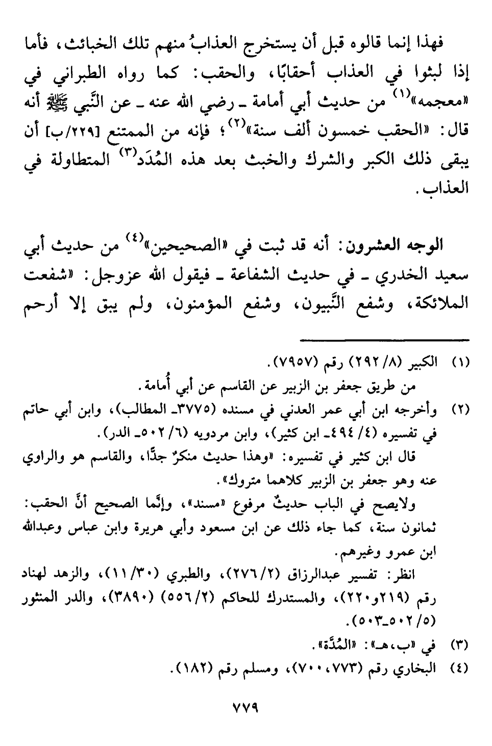 ولا يصح في الباب حديثٌ مرفوع "مسند"، وإنَّما الصحيح أنَّ الحقب: ثمانون سنة، كما جاء ذلك عن ابن مسعود وأبي هريرة وابن عباس وعبد اللَّه ابن عمرو وغيرهم.