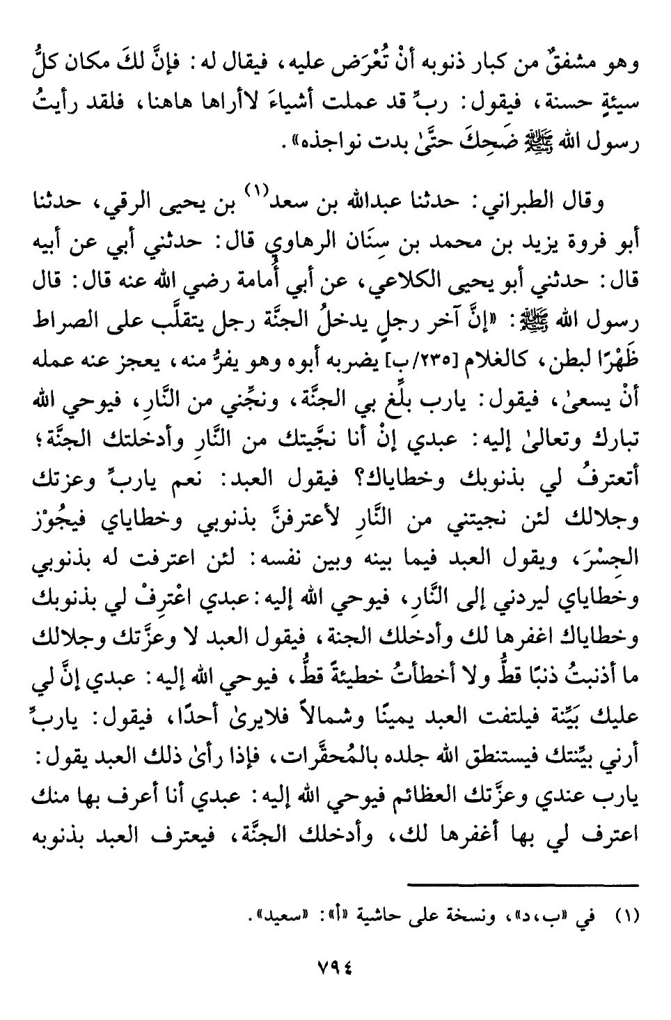 وقال الطبراني: حدثنا عبد اللَّه بن سعد (¬١) بن يحيى الرقي، حدثنا أبو فروة يزيد بن محمَّد بن سِنَان الرهاوي قال: حدثني أبي عن أبيه قال: حدثني أبو يحيى الكلاعي، عن أبي أُمامة رضي اللَّه عنه قال: قال رسول اللَّه -صلى اللَّه عليه وسلم-: "إنَّ آخر رجلٍ يدخلُ الجنَّة رجل يتقلَّب على الصراط ظَهْرًا لبطن، كالغلام يضربه أبوه وهو يفرُّ منه، يعجز عنه عمله أنْ يسعى، فيقول: يا رب بلِّغ بي الجنَّة، ونجِّني من النَّارِ، فيوحي اللَّه تبارك وتعالى إليه: عبدي إنْ أنا نجَّيتك من النَّارِ وأدخلتك الجنَّة؛ أتعترفُ لي بذنوبك وخطاياك؟ فيقول العبد: نعم يا ربِّ وعزتك وجلالك لئن نجيتني من النَّارِ لأعترفنَّ بذنوبي وخطاياي فيجُوْز الجِسْرَ، ويقول العبد فيما بينه وبين نفسه: لئن اعترفت له بذنوبي وخطاياي ليردني إلى النَّارِ، فيوحي اللَّه إليه: عبدي اعْترِفْ لي بذنوبك وخطاياك اغفرها لك وأدخلك الجنة، فيقول العبد لا وعزَّتك وجلالك ما أذنبتُ ذنبًا قطُّ ولا أخطأتُ خطيئةً قطُّ، فيوحي اللَّه إليه: عبدي إنَّ لي عليك بَيِّنة فيلتفت العبد يمينًا وشمالًا فلا يرى أحدًا، فيقول: يا ربِّ أرني بيِّنتك فيستنطق اللَّه جلده بالمُحقَّرات، فإذا رأى ذلك العبد يقول: يا رب عندي وعزَّتك العظائم فيوحي اللَّه إليه: عبدي أنا أعرف بها منك اعترف لي بها أغفرها لك، وأدخلك الجنَّة، فيعترف العبد بذنوبه