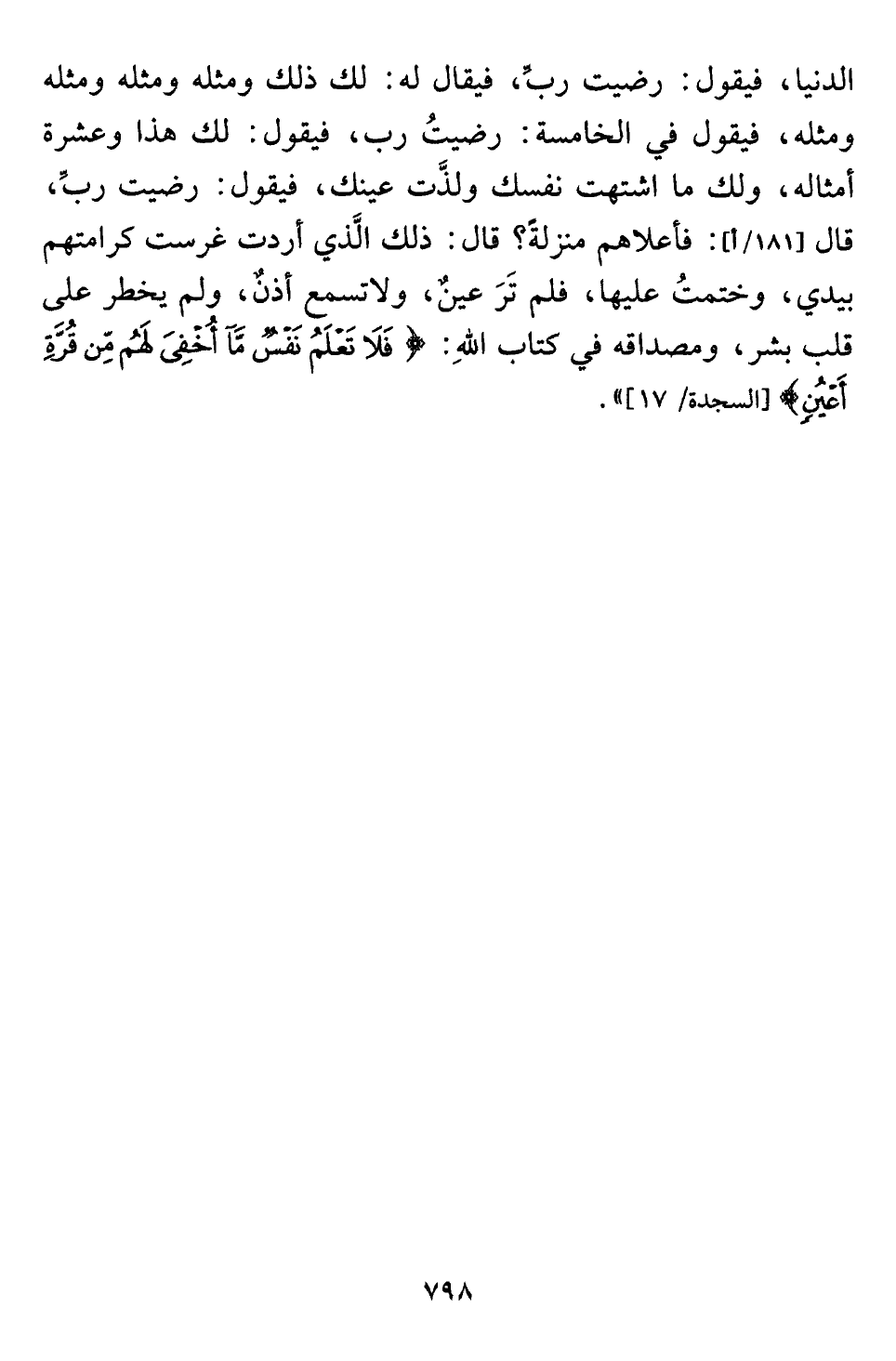 الدنيا، فيقول رضيت ربِّ, فيقال له: لك ذلك ومثله ومثله ومثله ومثله، فيقول في الخامسة: رضيتُ رب، فيقول: لك هذا وعشرة أمثاله، ولك ما اشتهت نفسك ولذَّت عينك، فيقول: رضيت ربِّ، قال: فأعلاهم منزلةً؟ قال: ذلك الَّذي أردت غرست كرامتهم بيدي، وختمتُ عليها، فلم تَرَ عينٌ، ولا تسمع أذنٌ، ولم يخطر على قلب بشر، ومصداقه في كتاب اللَّهِ: {فَلَا تَعْلَمُ نَفْسٌ مَا أُخْفِيَ لَهُمْ مِنْ قُرَّةِ أَعْيُنٍ} [السجدة: ١٧] ".
