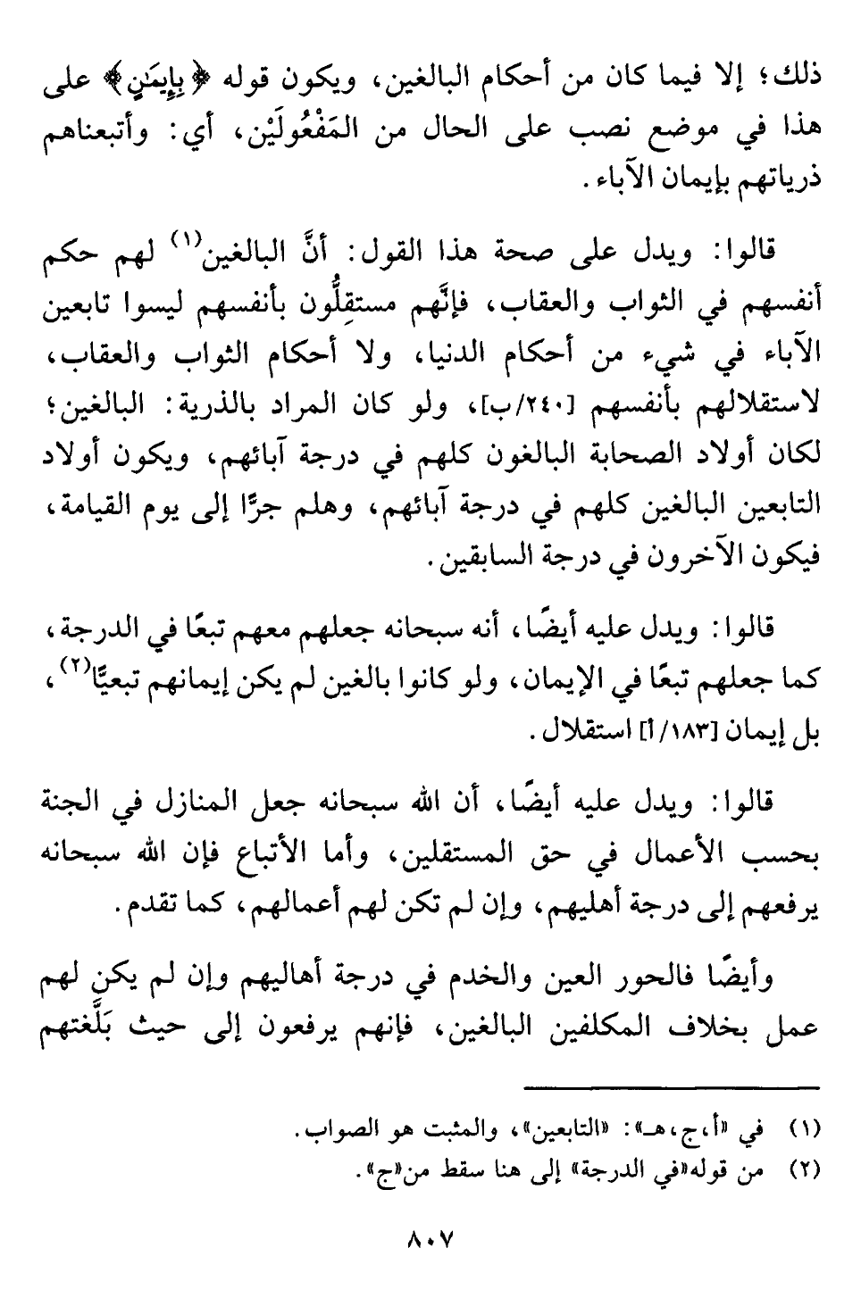 قالوا: ويدل عليه أيضًا، أنه سبحانه جعلهم معهم تبعًا في الدرجة، كما جعلهم تبعًا في الإيمان، ولو كانوا بالغين لم يكن إيمانهم تبعيًّا (¬٢) ، بل إيمان استقلال.
