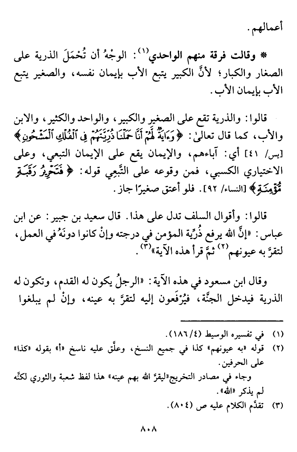 قالوا: وأقوال السلف تدل على هذا. قال سعيد بن جبير: عن ابن عباس: "إنَّ اللَّه يرفع ذُرِّية المؤمن في درجته وإنْ كانوا دونَهُ في العمل، لتقرَّ به عيونهم (¬٢) ثمَّ قرأ هذه الآية" (¬٣) .
