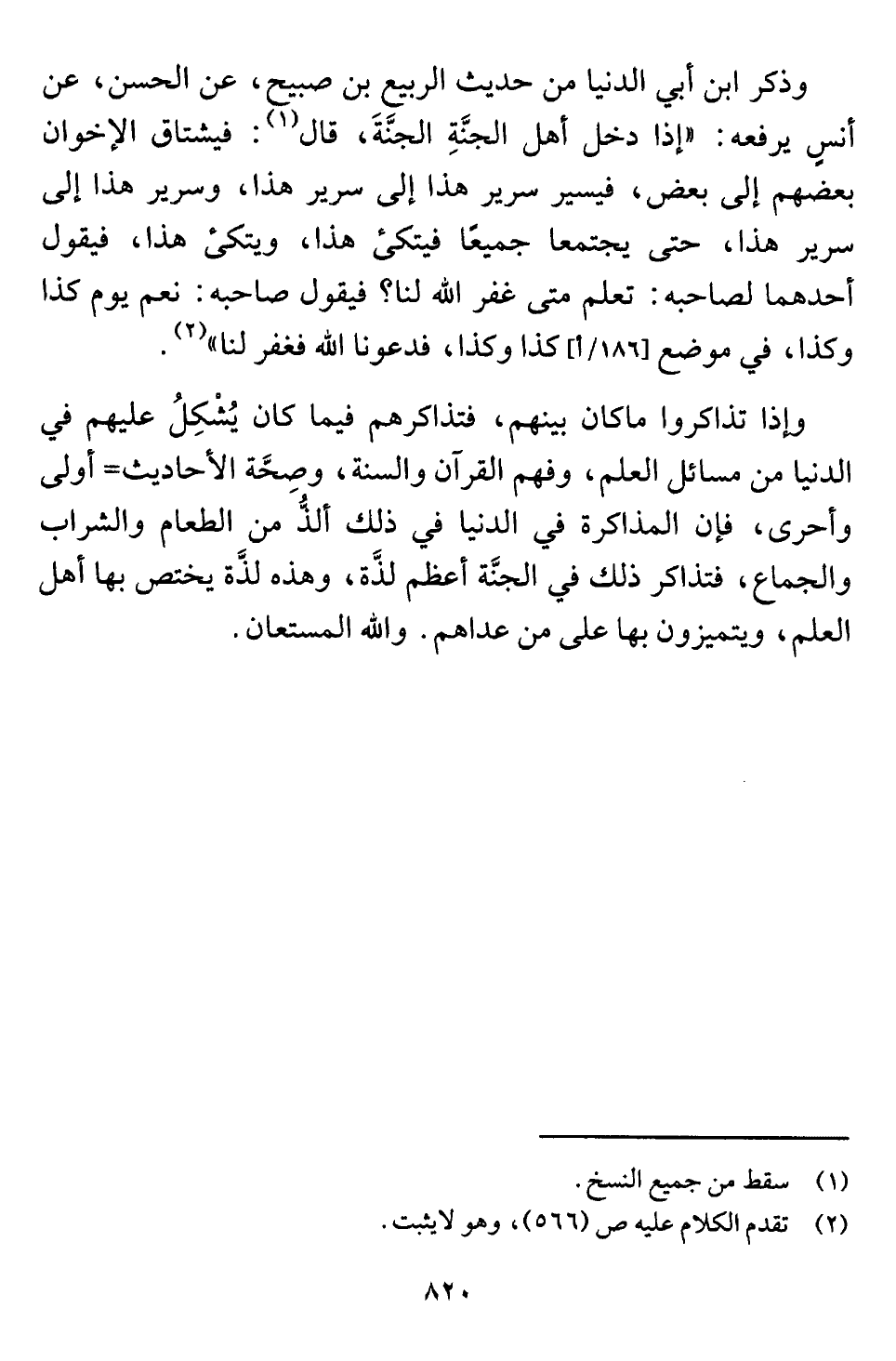 وإذا تذاكروا ما كان بينهم، فتذاكرهم فيما كان يُشْكِلُ عليهم في الدنيا من مسائل العلم، وفهم القرآن والسنة، وصِحَّة الأحاديث = أولى وأحرى، فإن المذاكرة في الدنيا في ذلك ألذُّ من الطعام والشراب والجماع، فتذاكر ذلك في الجنَّة أعظم لذَّة، وهذه لذَّة يختص بها أهل العلم، ويتميزون بها على من عداهم. واللَّه المستعان.