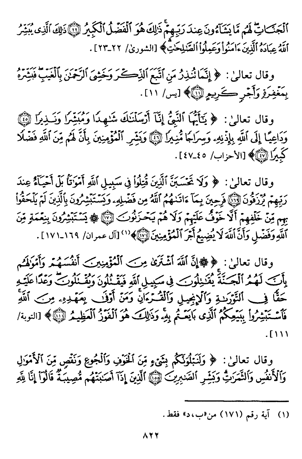 وقال تعالى: {وَلَا تَحْسَبَنَّ الَّذِينَ قُتِلُوا فِي سَبِيلِ اللَّهِ أَمْوَاتًا بَلْ أَحْيَاءٌ عِنْدَ رَبِّهِمْ يُرْزَقُونَ (١٦٩) فَرِحِينَ بِمَا آتَاهُمُ اللَّهُ مِنْ فَضْلِهِ وَيَسْتَبْشِرُونَ بِالَّذِينَ لَمْ يَلْحَقُوا بِهِمْ مِنْ خَلْفِهِمْ أَلَّا خَوْفٌ عَلَيْهِمْ وَلَا هُمْ يَحْزَنُونَ (١٧٠) يَسْتَبْشِرُونَ بِنِعْمَةٍ مِنَ اللَّهِ وَفَضْلٍ وَأَنَّ اللَّهَ لَا يُضِيعُ أَجْرَ الْمُؤْمِنِينَ (١٧١) } (¬١) [آل عمران: ١٦٩ - ١٧١].