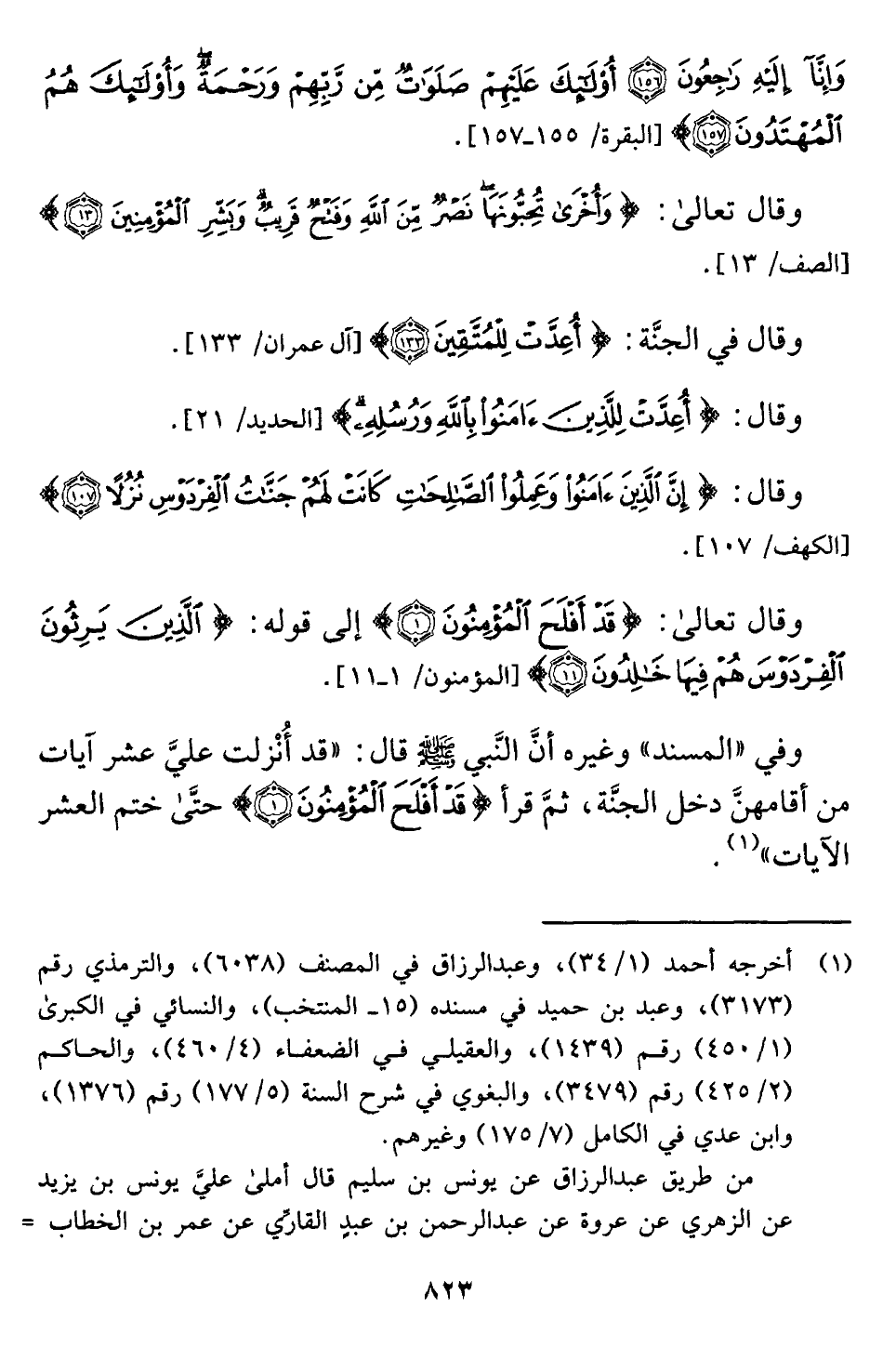 وقال تعالى: {قَدْ أَفْلَحَ الْمُؤْمِنُونَ (١ )} إلى قوله: {الَّذِينَ يَرِثُونَ الْفِرْدَوْسَ هُمْ فِيهَا خَالِدُونَ (١١) } [المؤمنون: ١ - ١١].
