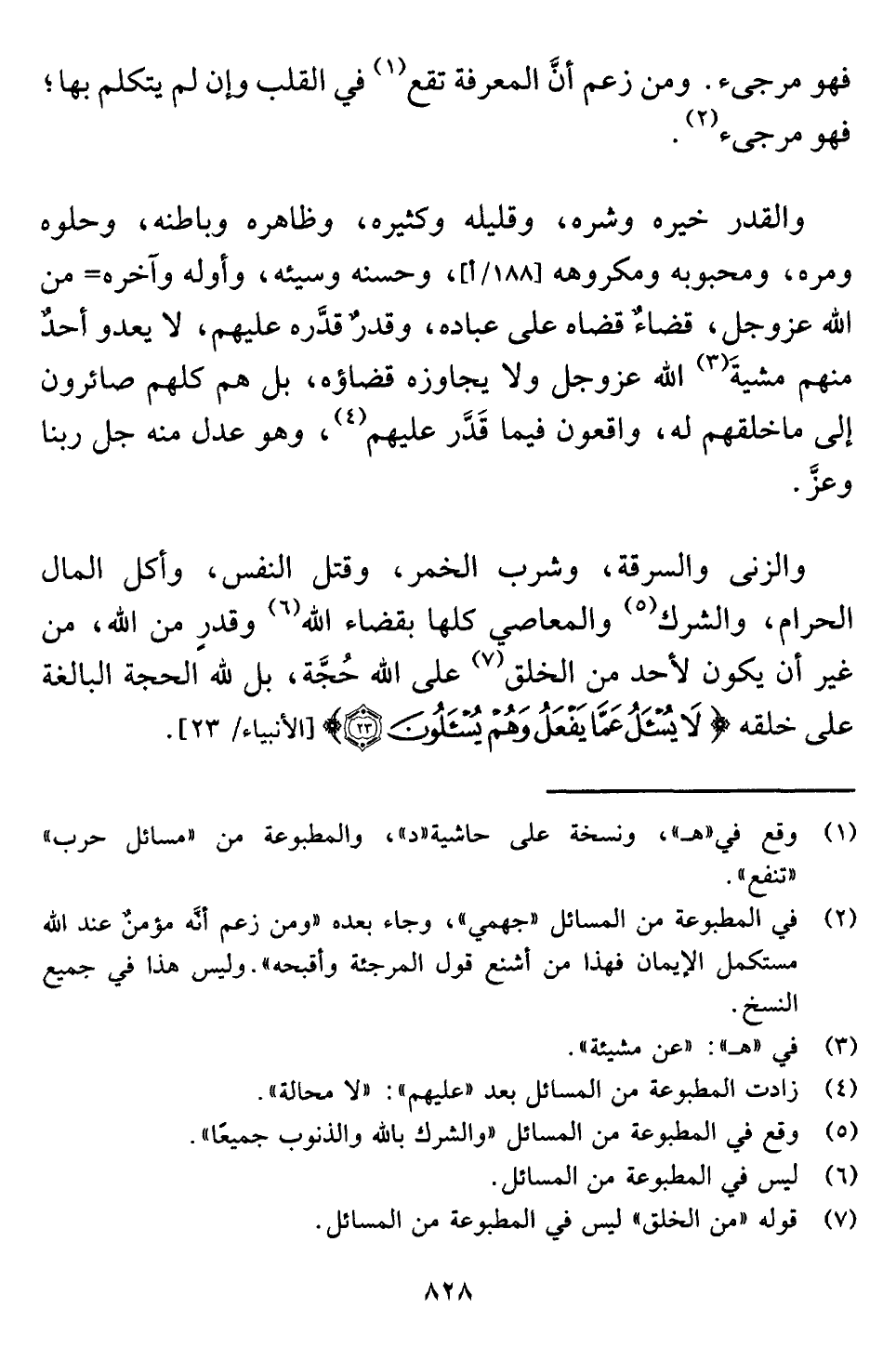 والزنى والسرقة، وشرب الخمر، وقتل النفس، وأكل المال الحرام، والشرك (¬٥) والمعاصي كلها بقضاء اللَّه (¬٦) وقدرٍ من اللَّه، من غير أن يكون لأحد من الخلق (¬٧) على اللَّه حُجَّة، بل للَّه الحجة البالغة على خلقه {لَا يُسْأَلُ عَمَّا يَفْعَلُ وَهُمْ يُسْأَلُونَ (٢٣) } [الأنبياء: ٢٣].