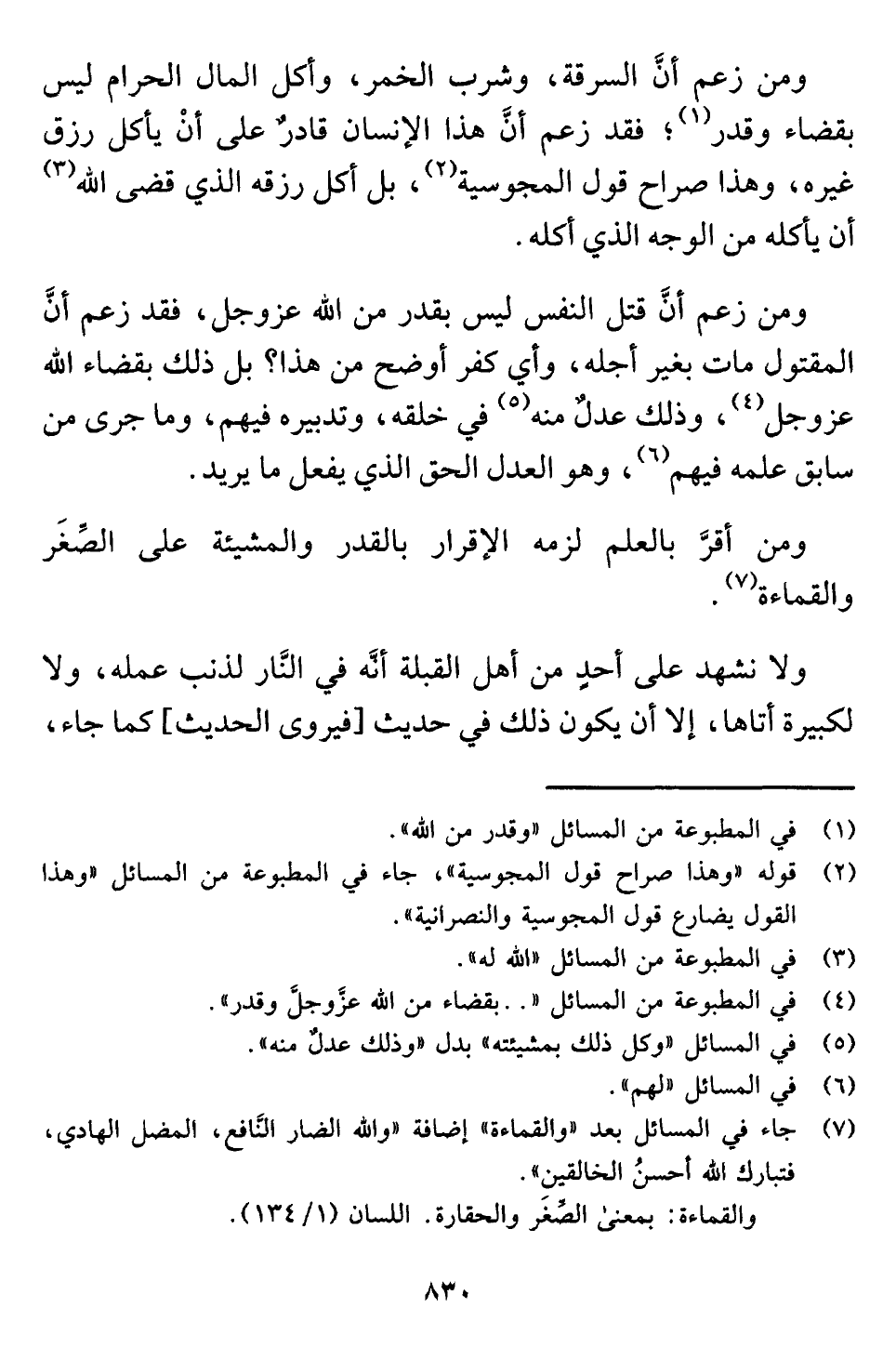 ومن زعم أنَّ السرقة، وشرب الخمر، وأكل المال الحرام ليس بقضاء وقدر (¬١) ؛ فقد زعم أنَّ هذا الإنسان قادرٌ على أنْ يأكل رزق غيره، وهذا صراح قول المجوسية (¬٢) ، بل أكل رزقه الذي قضى اللَّه (¬٣) أن يأكله من الوجه الذي أكله.