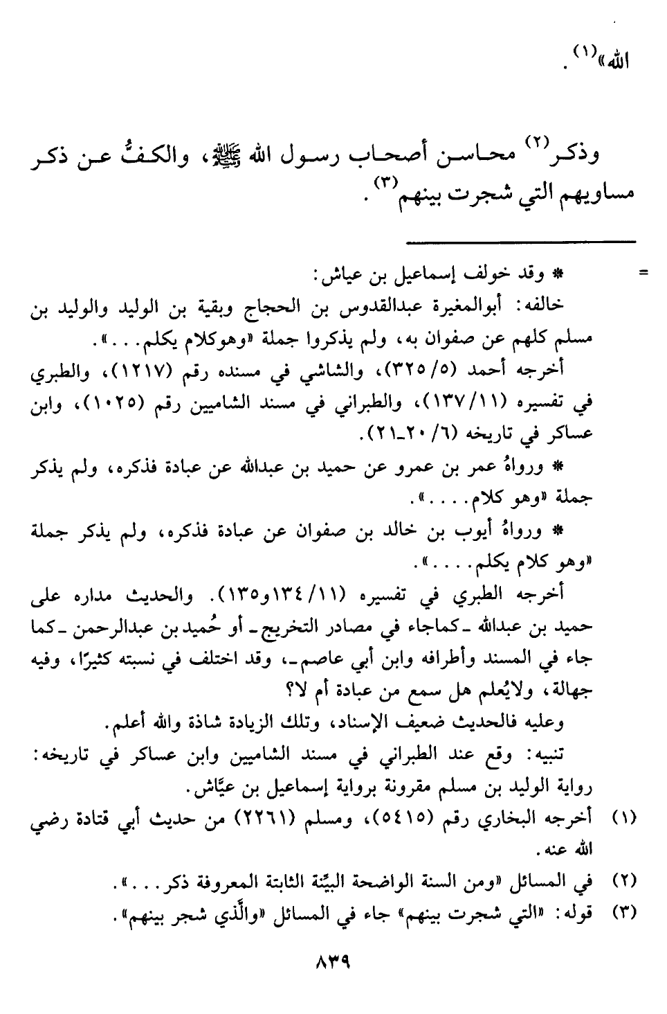 وذكر (¬٢) محاسن أصحاب رسول اللَّه -صلى اللَّه عليه وسلم-، والكفُّ عن ذكر مساويهم التي شجرت بينهم (¬٣) .
